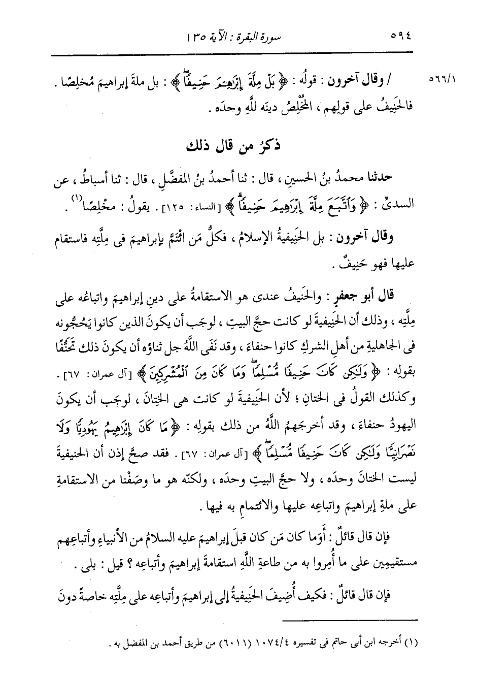 ذِكْرُ مَنْ قَالَ ذَلِكَ حَدَّثَنَا مُحَمَّدُ بْنُ الْحُسَيْنِ، قَالَ: ثَنَا أَحْمَدُ بْنُ الْمُفَضَّلِ، قَالَ: ثَنَا أَسْبَاطٌ، عَنِ السُّدِّيِّ: " {§وَاتَّبِعْ مِلَّةَ إِبْرَاهِيمَ حَنِيفًا} [النساء: 125] يَقُولُ: مُخْلِصًا " وَقَالَ آخَرُونَ: بَلِ الْحَنِيفِيَّةُ الْإِسْلَامُ، فَكُلُّ مَنِ ائْتَمَّ بِإِبْرَاهِيمَ فِي مِلَّتِهِ فَاسْتَقَامَ عَلَيْهَا فَهُوَ حُنَيْفٌ. قَالَ أَبُو جَعْفَرٍ: الْحَنِيفُ عِنْدِي هُوَ الِاسْتِقَامَةُ عَلَى دِينِ إِبْرَاهِيمَ وَاتِّبَاعُهُ عَلَى مِلَّتِهِ. وَذَلِكَ أَنَّ الْحَنِيفِيَّةَ لَوْ كَانَتْ حَجَّ الْبَيْتِ لَوَجَبَ أَنْ يَكُونَ الَّذِينَ كَانُوا يَحُجُّونَهُ فِي الْجَاهِلِيَّةِ مِنْ أَهْلِ الشِّرْكِ كَانُوا حُنَفَاءَ، وَقَدْ نَفَى اللَّهُ أَنْ يَكُونَ ذَلِكَ تَحَنُّفًا بِقَوْلِهِ: {وَلَكِنْ كَانَ حَنِيفًا مُسْلِمًا وَمَا كَانَ مِنَ الْمُشْرِكِينَ} [آل عمران: 67] فَكَذَلِكَ الْقَوْلُ فِي الْخِتَانِ؛ لِأَنَّ الْحَنِيفِيَّةَ لَوْ كَانَتْ هِيَ الْخِتَانُ لَوَجَبَ أَنْ يَكُونَ الْيَهُودُ حُنَفَاءَ، وَقَدْ أَخْرَجَهُمُ اللَّهُ مِنْ ذَلِكَ بِقَوْلِهِ: {مَا كَانَ إِبْرَاهِيمُ يَهُودِيًّا وَلَا نَصْرَانِيًّا وَلَكِنْ كَانَ حَنِيفًا مُسْلِمًا} [آل عمران: 67] . فَقَدْ صَحَّ إِذًا أَنَّ الْحَنِيفِيَّةَ لَيْسَتِ الْخِتَانَ وَحْدَهُ، وَلَا حَجَّ الْبَيْتِ وَحْدَهُ، وَلَكِنَّهُ هُوَ مَا وَصَفْنَا مِنَ الِاسْتِقَامَةِ عَلَى مِلَّةِ إِبْرَاهِيمَ وَاتِّبَاعِهِ عَلَيْهَا وَالِائْتِمَامِ بِهِ فِيهَا. فَإِنْ قَالَ قَائِلٌ: فَكَيْفَ أُضِيفَ الْحَنِيفِيَّةُ إِلَى إِبْرَاهِيمَ وَأَتْبَاعِهِ عَلَى مِلَّتِهِ خَاصَّةً دُونَ