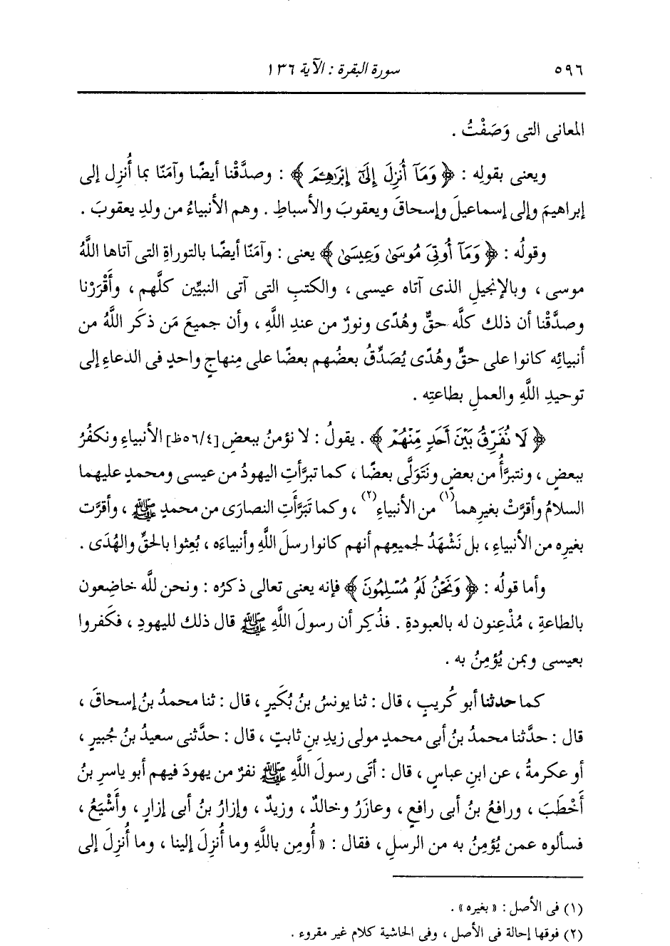 {§لَا نُفَرِّقُ بَيْنَ أَحَدٍ مِنْهُمْ} [البقرة: 136] يَقُولُ: لَا نُؤْمِنُ بِبَعْضِ الْأَنْبِيَاءِ وَنَكْفُرُ بِبَعْضٍ، وَنَتَبَرَّأُ مِنْ بَعْضٍ، وَنَتَوَلَّى بَعْضًا، كَمَا تَبَرَّأَتِ الْيَهُودُ مِنْ عِيسَى وَمُحَمَّدٍ عَلَيْهِمَا السَّلَامُ وَأُقِرَّتْ بِغَيْرِهِمَا مِنَ الْأَنْبِيَاءِ، وَكَمَا تَبَرَّأَتِ النَّصَارَى مِنْ مُحَمَّدٍ صَلَّى اللهُ عَلَيْهِ وَسَلَّمَ وَأُقِرَّتْ بِغَيْرِهِ مِنَ الْأَنْبِيَاءِ؛ بَلْ نَشْهَدُ لِجَمِيعِهِمْ أَنَّهُمْ كَانُوا رُسُلَ اللَّهِ وَأَنْبِيَاءَهُ، بُعِثُوا بِالْحَقِّ وَالْهُدَى
