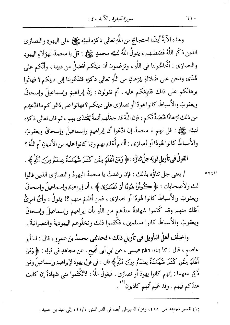 فَحَدَّثَنِي مُحَمَّدُ بْنُ عَمْرٍو، قَالَ: ثَنَا أَبُو عَاصِمٍ، قَالَ: ثَنَا عِيسَى، عَنِ ابْنِ أَبِي نَجِيحٍ، عَنْ مُجَاهِدٍ: " فِي قَوْلِهِ: {§وَمَنْ أَظْلَمُ مِمَّنْ كَتَمَ شَهَادَةً عِنْدَهُ مِنَ اللَّهِ} [البقرة: 140] ، قَالَ: فِي قَوْلِ يَهُودَ لِإِبْرَاهِيمَ وَإِسْمَاعِيلَ وَمَنْ ذَكَرَ مَعَهُمَا إِنَّهُمْ كَانُوا يَهُودًا أَوْ نَصَارَى. فَيَقُولُ اللَّهُ: لَا تَكْتُمُوا مِنِّي شَهَادَةً إِنْ كَانَتْ عِنْدَكُمْ فِيهِمْ. وَقَدْ عَلِمَ أَنَّهُمْ كَاذِبُونَ "