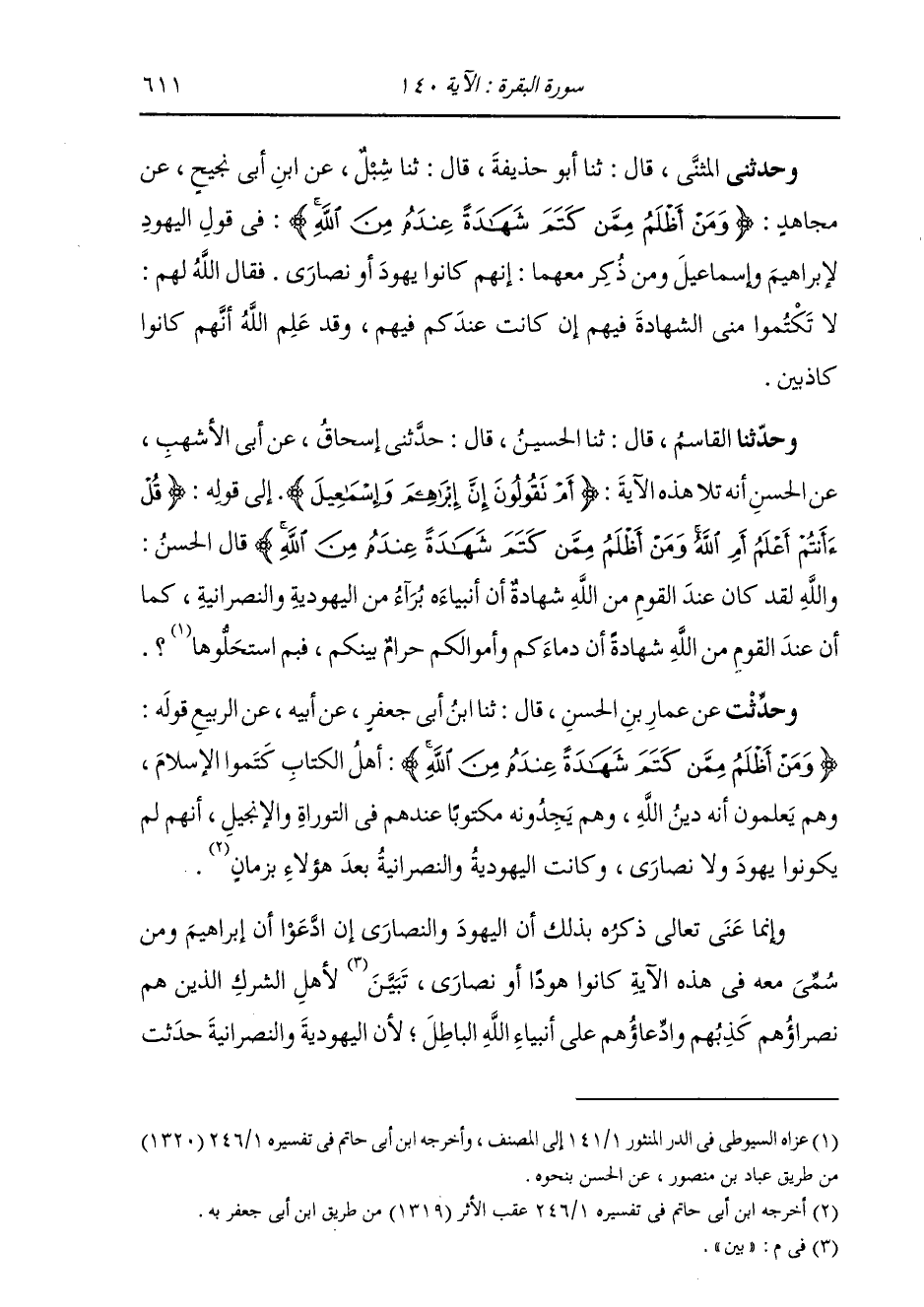 حَدَّثَنِي الْمُثَنَّى، قَالَ: ثَنَا أَبُو حُذَيْفَةَ، قَالَ: ثَنَا شِبْلٌ، عَنِ ابْنِ أَبِي نَجِيحٍ، عَنْ مُجَاهِدٍ: " {§وَمَنْ أَظْلِمُ مِمَّنْ كَتَمَ شَهَادَةً عِنْدَهُ مِنَ اللَّهِ} [البقرة: 140] فِي قَوْلِ الْيَهُودِ لِإِبْرَاهِيمَ وَإِسْمَاعِيلَ وَمَنْ ذَكَرَ مَعَهُمَا إِنَّهُمْ كَانُوا يَهُودًا أَوْ نَصَارَى. فَقَالَ اللَّهُ لَهُمْ: لَا تَكْتُمُوا مِنِّي الشَّهَادَةَ فِيهِمْ إِنْ كَانَتْ عِنْدَكُمْ فِيهِمْ. وَقَدْ عَلِمَ اللَّهُ أَنَّهُمْ كَانُوا كَاذِبِينَ "