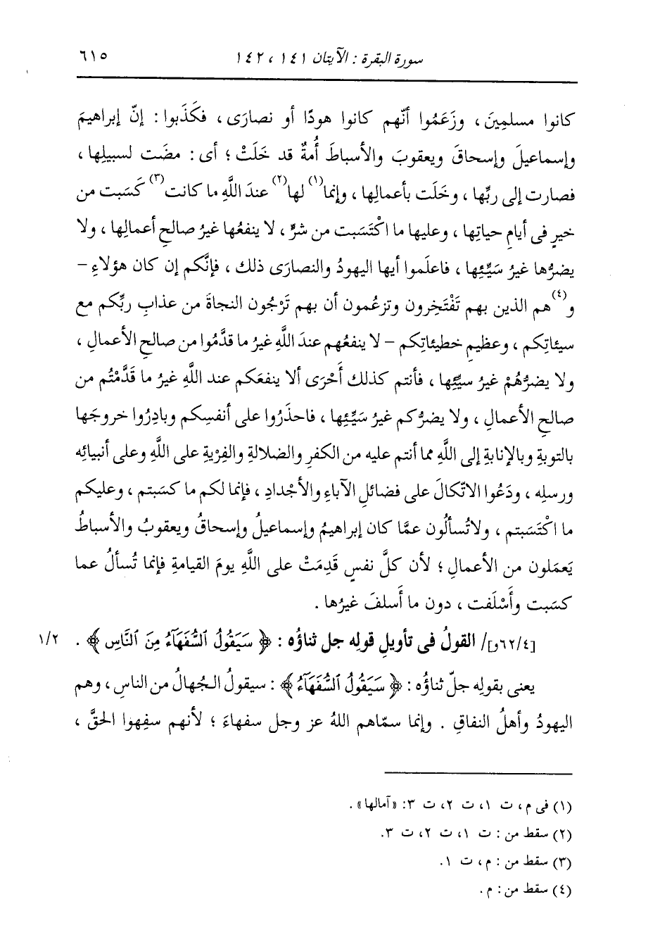 §يَعْنِي بِقَوْلِهِ جَلَّ ثَنَاؤُهُ {سَيَقُولُ السُّفَهَاءُ} [البقرة: 142] سَيَقُولُ الْجُهَّالُ مِنَ النَّاسِ وَهُمُ الْيَهُودُ، وَأَهْلُ النِّفَاقِ وَإِنَّمَا سَمَّاهُمُ اللَّهُ عَزَّ وَجَلَّ سُفَهَاءً، لِأَنَّهُمْ سَفِهُوا الْحَقَّ -[616]- فَتَجَاهَلَتْ أَحْبَارُ الْيَهُودِ وَتَعَاظَمَتْ جُهَالَهُمْ وَأَهْلُ الْغَبَاءِ مِنْهُمْ عَنْ اتِّبَاعِ مُحَمَّدٍ صَلَّى اللهُ عَلَيْهِ وَسَلَّمَ إِذَا كَانَ مِنَ الْعَرَبِ وَلَمْ يَكُنْ مِنْ بَنِي إِسْرَائِيلَ، وَتَحَيَّرَ الْمُنَافِقُونَ فَتَبَلَّدُوا، وَبِمَا قُلْنَا فِي السُّفَهَاءِ إِنَّهُمْ هُمُ الْيَهُودُ , أَهْلُ نِفَاقٍ قَالَ أَهْلُ التَّأَوْيلِ