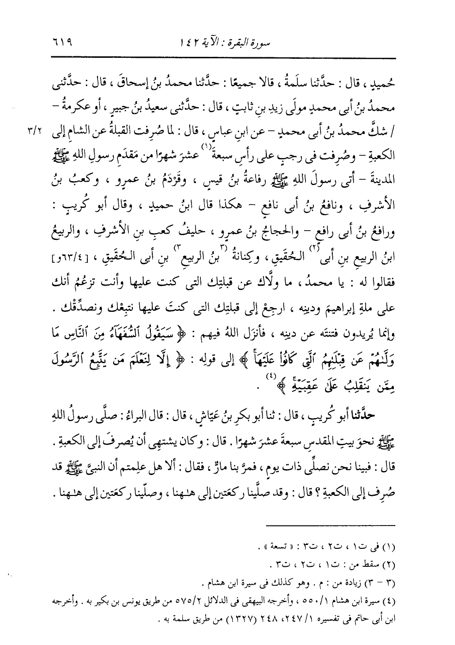 حَدَّثَنَا أَبُو كُرَيْبٍ، قَالَ: ثنا أَبُو بَكْرِ بْنُ عَيَّاشٍ، قَالَ الْبَرَاءُ، " §صَلَّى رَسُولُ اللَّهِ صَلَّى اللهُ عَلَيْهِ وَسَلَّمَ نَحْوَ بَيْتِ الْمَقْدِسِ سَبْعَةَ عَشَرَ شَهْرًا، وَكَانَ يَشْتَهِي أَنْ يُصْرَفَ إِلَى الْكَعْبَةِ. قَالَ: فَبَيْنَا نَحْنُ نُصَلِّي ذَاتَ يَوْمٍ، فَمَرَّ بِنَا مَارٌّ، فَقَالَ: أَلَا هَلْ عَلِمْتُمْ أَنَّ النَّبِيَّ صَلَّى اللهُ عَلَيْهِ وَسَلَّمَ قَدْ صُرِفَ إِلَى الْكَعْبَةِ؟ قَالَ: وَقَدْ صَلَّيْنَا رَكْعَتَيْنِ إِلَى هَا هُنَا، وَصَلَّيْنَا رَكْعَتَيْنِ إِلَى هَا هُنَا " -[620]- قَالَ أَبُو كُرَيْبٍ: فَقِيلَ لَهُ: فِيهِ أَبُو إِسْحَاقَ؟ فَسَكَتَ
