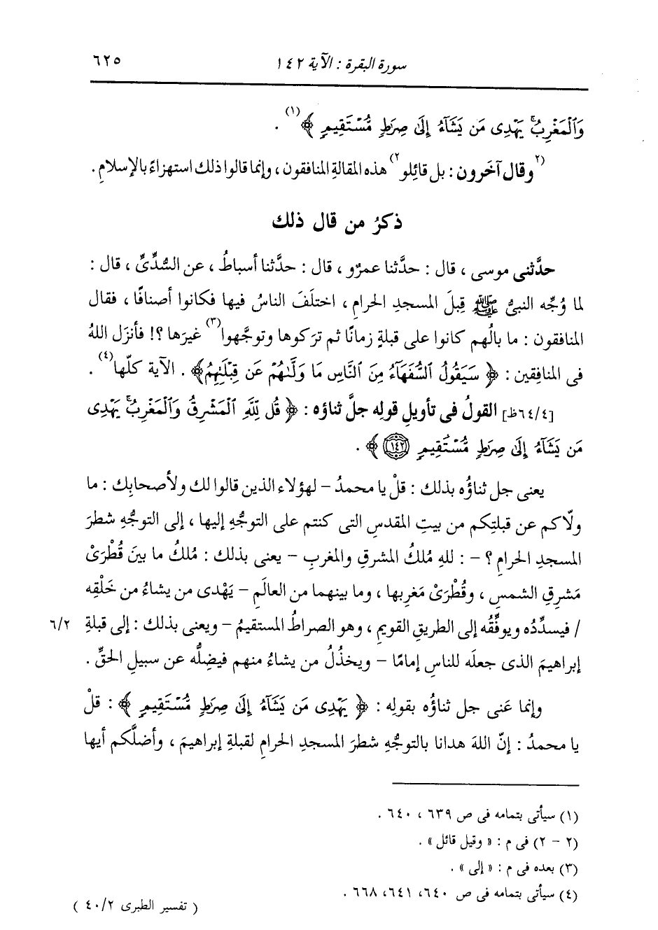 ذِكْرُ مَنْ قَالَ ذَلِكَ حَدَّثَنِي مُوسَى، قَالَ: ثنا عَمْرٌو، قَالَ: ثنا أَسْبَاطٌ، عَنِ السُّدِّيِّ، قَالَ: " لَمَّا وُجِّهَ النَّبِيُّ صَلَّى اللهُ عَلَيْهِ وَسَلَّمَ قِبَلَ الْمَسْجِدِ الْحَرَامِ، اخْتَلَفَ النَّاسُ فِيهَا، فَكَانُوا أَصْنَافًا، فَقَالَ الْمُنَافِقُونَ: مَا بَالُهُمْ كَانُوا عَلَى قِبْلَةٍ زَمَانًا، ثُمَّ تَرَكُوهَا وَتَوَجَّهُوا إِلَى غَيْرِهَا؟ فَأَنْزَلَ اللَّهُ فِي الْمُنَافِقِينَ: {§سَيَقُولُ السُّفَهَاءُ مِنَ النَّاسِ} [البقرة: 142] الْآيَةَ كُلُّهَا "
