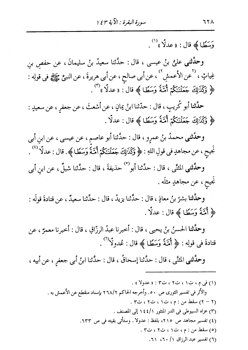 حَدَّثَنِي مُحَمَّدُ بْنُ عَمْرٍو، قَالَ: ثنا أَبُو عَاصِمٍ، عَنْ عِيسَى، عَنِ ابْنِ أَبِي نَجِيحٍ، عَنْ مُجَاهِدٍ، " فِي قَوْلِ اللَّهِ عَزَّ وَجَلَّ: {§وَكَذَلِكَ جَعَلْنَاكُمْ أُمَّةً وَسَطًا} [البقرة: 143] قَالَ: عُدُولًا " حَدَّثَنِي الْمُثَنَّى، قَالَ: ثنا حُذَيْفَةُ، قَالَ: ثنا شِبْلٌ، عَنِ ابْنِ أَبِي نَجِيحٍ، عَنْ مُجَاهِدِ مِثْلَهُ