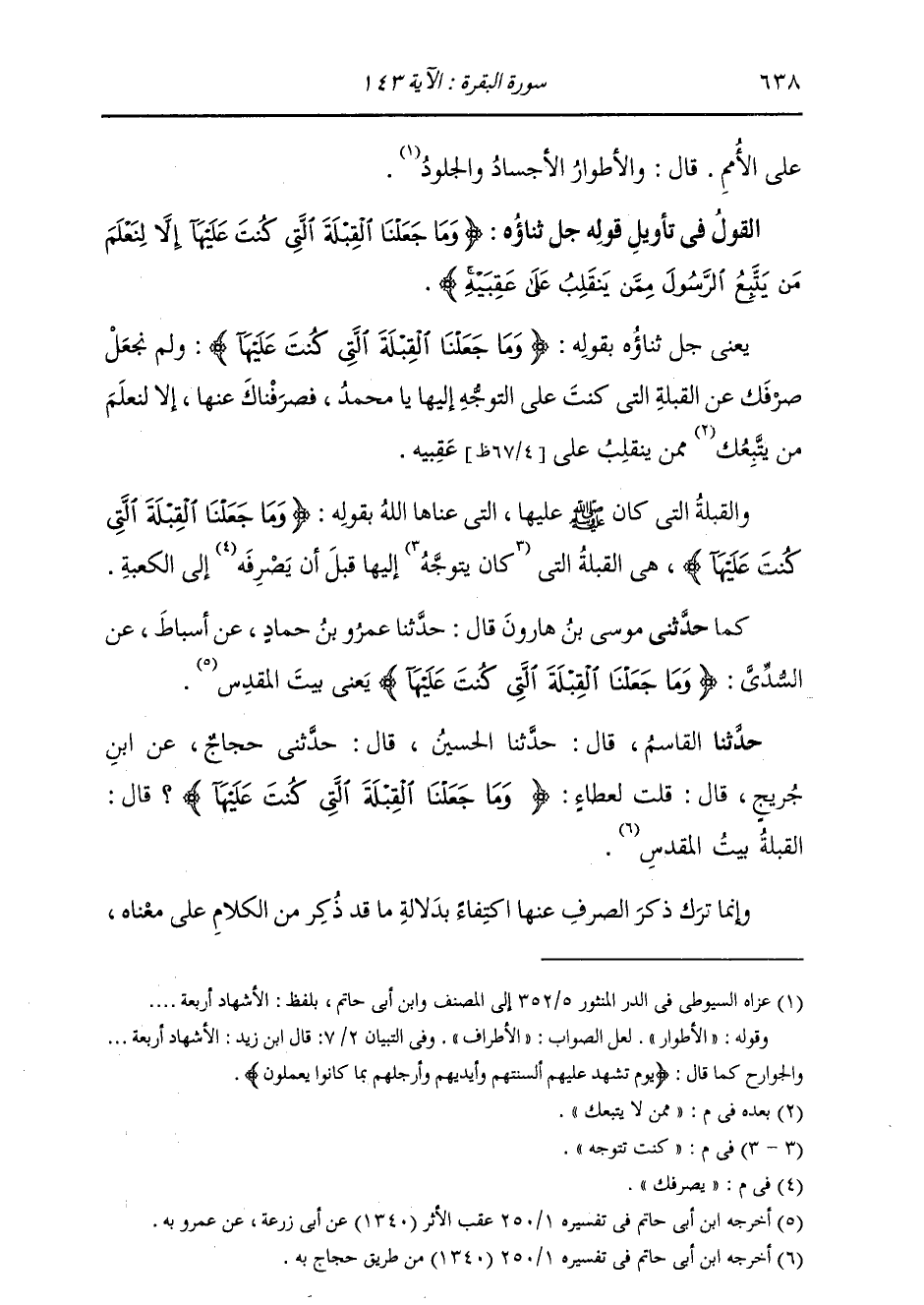 حَدَّثَنِي مُوسَى بْنُ هَارُونَ، قَالَ: ثنا عَمْرٌو، قَالَ: ثنا أَسْبَاطُ، عَنِ السُّدِّيِّ: " {§وَمَا جَعَلْنَا الْقِبْلَةَ الَّتِي كُنْتَ عَلَيْهَا} [البقرة: 143] يَعْنِي بَيْتَ الْمَقْدِسِ "