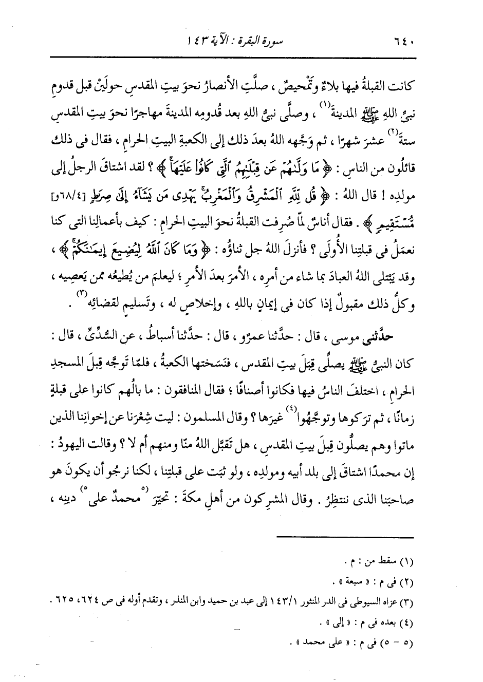 حَدَّثَنِي مُوسَى، قَالَ: ثنا عَمْرٌو، قَالَ: ثنا أَسْبَاطٌ، عَنِ السُّدِّيِّ، قَالَ: " كَانَ النَّبِيُّ صَلَّى اللهُ عَلَيْهِ وَسَلَّمَ يُصَلِّي قِبَلَ بَيْتِ الْمَقْدِسِ، فَنَسَخَتْهَا الْكَعْبَةُ. فَلَمَّا وُجِّهَ قِبَلَ الْمَسْجِدِ الْحَرَامِ، اخْتَلَفَ النَّاسُ فِيهَا، فَكَانُوا أَصْنَافًا؛ فَقَالَ الْمُنَافِقُونَ: مَا بَالُهُمْ كَانُوا عَلَى قِبْلَةٍ زَمَانًا، ثُمَّ تَرَكُوهَا وَتَوَجَّهُوا إِلَى غَيْرِهَا؟ وَقَالَ الْمُسْلِمُونَ: لَيْتَ شِعْرَنَا عَنْ إِخْوَانِنَا الَّذِينَ مَاتُوا وَهُمْ يُصَلُّونَ قِبَلَ بَيْتِ الْمَقْدِسِ، هَلْ تَقَبَّلَ اللَّهُ مِنَّا وَمِنْهُمْ أَوْ لَا؟ وَقَالَتِ الْيَهُودُ: إِنَّ مُحَمَّدًا اشْتَاقَ إِلَى بَلَدِ أَبِيهِ وَمَوْلِدِهِ، وَلَوْ ثَبَتَ عَلَى قِبْلَتِنَا لَكِنَّا نَرْجُو أَنْ يَكُونَ هُوَ صَاحِبَنَا الَّذِي نَنْتَظِرُ. وَقَالَ الْمُشْرِكُونَ مِنْ أَهْلِ مَكَّةَ، تَحَيَّرَ عَلَى مُحَمَّدٍ دِينُهُ، -[641]- فَتَوَجَّهَ بِقِبْلَتِهِ إِلَيْكُمْ، وَعَلِمَ أَنَّكُمْ كُنْتُمْ أَهْدَى مِنْهُ، وَيُوشِكُ أَنْ يَدْخُلَ فِي دِينِكُمْ. فَأَنْزَلَ اللَّهُ جَلَّ ثَنَاؤُهُ فِي الْمُنَافِقِينَ: {§سَيَقُولُ السُّفَهَاءُ مِنَ النَّاسِ مَا وَلَّاهُمْ عَنْ قِبْلَتِهِمُ الَّتِي كَانُوا عَلَيْهَا} [البقرة: 142] إِلَى قَوْلِهِ {وَإِنْ كَانَتْ لَكَبِيرَةً إِلَّا عَلَى الَّذِينَ هَدَى اللَّهُ} [البقرة: 143] وَأَنْزَلَ فِي الْآخَرِينَ الْآيَاتِ بَعْدَهَا "