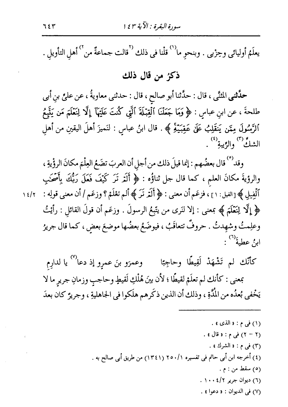 حَدَّثَنِي الْمُثَنَّى، قَالَ: حَدَّثَنَا أَبُو صَالِحٍ، قَالَ: حَدَّثَنِي مُعَاوِيَةُ بْنُ صَالِحٍ، عَنْ عَلِيِّ بْنِ أَبِي طَلْحَةَ، عَنِ ابْنِ عَبَّاسٍ {§وَمَا جَعَلْنَا الْقِبْلَةَ الَّتِي كُنْتَ عَلَيْهَا إِلَّا لِنَعْلَمَ مَنْ يَتَّبِعُ الرَّسُولَ مِمَّنْ يَنْقَلِبُ عَلَى عَقِبَيْهِ} [البقرة: 143] «قَالَ ابْنُ عَبَّاسٍ،» لِنُمَيِّزَ أَهْلَ الْيَقِينِ مِنْ أَهْلِ الشِّرْكِ وَالرِّيبَةِ " وَقَالَ بَعْضُهُمْ: إِنَّمَا قِيلَ ذَلِكَ مِنْ أَجْلِ أَنَّ الْعَرَبَ تَضَعُ الْعِلْمَ مَكَانَ الرُّؤْيَةِ، وَالرُّؤْيَةَ مَكَانَ الْعِلْمِ، كَمَا قَالَ جَلَّ ذِكْرُهُ: {أَلَمْ تَرَ كَيْفَ فَعَلَ رَبُّكَ بِأَصْحَابِ الْفِيلِ} [الفيل: 1] فَزَعَمَ أَنَّ مَعْنَى: {أَلَمْ تَرَ} [الفيل: 1] أَلَمْ تَعْلَمْ، وَزَعَمَ أَنَّ مَعْنَى قَوْلِهِ: {إِلَّا لِنَعْلَمَ} [البقرة: 143] بِمَعْنَى: إِلَّا لَنَرَى مَنْ يَتَّبِعُ الرَّسُولَ. وَزَعَمَ أَنَّ قَوْلَ الْقَائِلِ: رَأَيْتُ وَعَلِمْتُ وَشَهِدْتُ حُرُوفٌ تَتَعَاقَبُ فَيُوضَعُ بَعْضُهَا مَوْضِعَ بَعْضٍ، كَمَا قَالَ جَرِيرُ بْنُ عَطِيَّةَ: كَأَنَّكَ لَمْ تَشْهَدْ لَقِيطًا، وَحَاجِبًا، وَعَمْرَو بْنَ عَمْرٍو إِذَا دَعَا يَالَ دَارِمِ بِمَعْنَى: كَأَنَّكَ لَمْ تَعْلَمْ لَقِيطًا؛ لِأَنَّ بَيْنَ هَلْكِ لَقِيطٍ، وَحَاجِبٍ وَزَمانِ جَرِيرٍ مَا لَا يَخْفَى بَعْدُهُ مِنَ الْمُدَّةِ؛ وَذَلِكَ أَنَّ الَّذِينَ ذَكَرَهُمْ هَلَكُوا فِي الْجَاهِلِيَّةِ، وَجَرِيرٌ كَانَ بَعْدَ