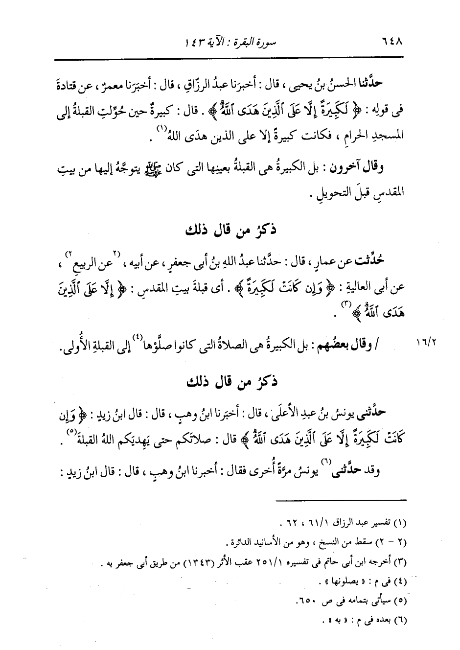حَدَّثَنَا الْحَسَنُ بْنُ يَحْيَى، قَالَ: أَخْبَرَنَا عَبْدُ الرَّزَّاقِ، قَالَ: أَخْبَرَنَا مَعْمَرٌ، عَنْ قَتَادَةَ، فِي قَوْلِهِ: {§لَكَبِيرَةً إِلَّا عَلَى الَّذِينَ هَدَى اللَّهُ} [البقرة: 143] قَالَ: «كَبِيرَةً حِينَ حُوِّلَتِ الْقِبْلَةُ إِلَى الْمَسْجِدِ الْحَرَامِ، فَكَانَتْ كَبِيرَةً إِلَّا عَلَى الَّذِينَ هَدَى اللَّهُ» وَقَالَ آخَرُونَ: بَلِ الْكَبِيرَةُ هِيَ الْقِبْلَةُ بِعَيْنِهَا الَّتِي كَانَ صَلَّى اللهُ عَلَيْهِ وَسَلَّمَ يَتَوَجَّهُ إِلَيْهَا مِنْ بَيْتِ الْمَقْدِسِ قَبْلَ التَّحْوِيلِ