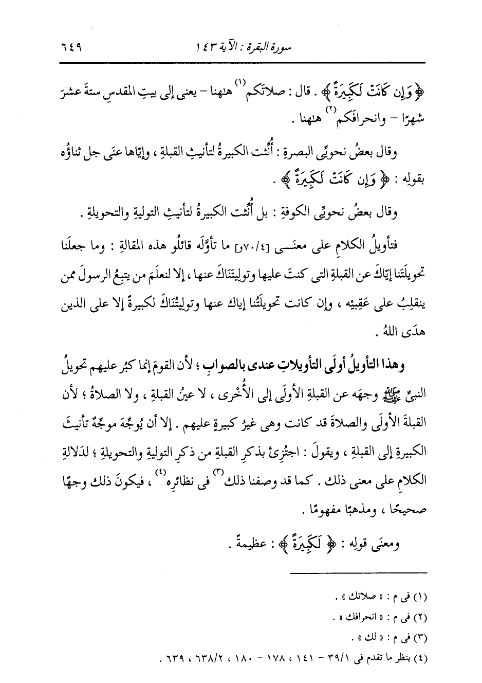 وَمَعْنَى قَوْلِهِ: {لَكَبِيرَةً} [البقرة: 45] عَظِيمَةً، -[650]- كَمَا حَدَّثَنَا يُونُسُ، قَالَ: أَخْبَرَنَا ابْنُ وَهْبٍ، قَالَ: قَالَ ابْنُ زَيْدٍ {§وَإِنْ كَانَتْ لَكَبِيرَةً إِلَّا عَلَى الَّذِينَ هَدَى اللَّهُ} [البقرة: 143] قَالَ: " كَبِيرَةٌ فِي صُدُورِ النَّاسِ فِيمَا يَدْخُلُ الشَّيْطَانُ بِهِ ابْنُ آدَمَ. قَالَهُ: مَا لَهُمْ صَلُّوا إِلَى هَا هُنَا سِتَّةَ عَشَرَ شَهْرًا ثُمَّ انْحَرفُوا فَكَبُرَ ذَلِكَ فِي صُدُورِ مَنْ لَا يَعْرِفُ وَلَا يَعْقِلُ وَالْمُنَافِقِينَ. فَقَالُوا: أَيُّ شَيْءٍ هَذَا الدِّينُ؟ وَأَمَّا الَّذِينَ آمَنُوا فَثَبَّتَ اللَّهُ جَلَّ ثَنَاؤُهُ ذَلِكَ فِي قُلُوبِهِمْ. وَقَرَأَ قَوْلَ اللَّهِ {وَإِنْ كَانَتْ لَكَبِيرَةً إِلَّا عَلَى الَّذِينَ هَدَى اللَّهُ} [البقرة: 143] قَالَ: صَلَاتُكُمْ حَتَّى يَهْدِيَكُمْ إِلَى الْقِبْلَةِ " قَالَ أَبُو جَعْفَرٍ: وَأَمَّا قَوْلُهُ: {إِلَّا عَلَى الَّذِينَ هَدَى اللَّهُ} [البقرة: 143] فَإِنَّهُ يُعْنَى بِهِ: وَإِنْ كَانَ تَقْلِيبَتُنَاكَ عَنِ الْقِبْلَةِ الَّتِي كُنْتَ عَلَيْهَا لَعَظِيمةً إِلَّا عَلَى مَنْ وَفَقَّهُ اللَّهُ جَلَّ ثَنَاؤُهُ فَهَداهُ لِتَصْدِيقِكَ، وَالْإِيمَانِ بِكَ وَبِذَلِكَ، وَاتِّبَاعِكَ فِيهِ وَفِيمَا أَنْزَلَ اللَّهُ تَعَالَى ذِكْرُهُ عَلَيْكَ