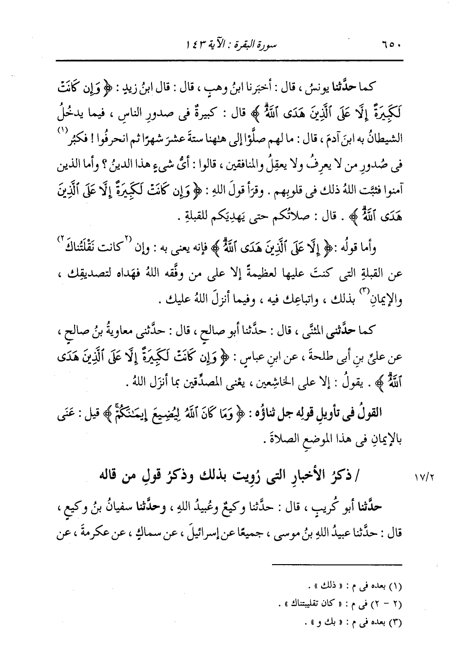 كَمَا حَدَّثَنِي الْمُثَنَّى، قَالَ: ثنا أَبُو صَالِحٍ، قَالَ: حَدَّثَنِي مُعَاوِيَةُ بْنُ صَالِحٍ، عَنْ عَلِيِّ بْنِ أَبِي طَلْحَةَ، عَنِ ابْنِ عَبَّاسٍ {§وَإِنْ كَانَتْ لَكَبِيرَةً إِلَّا عَلَى الَّذِينَ هَدَى اللَّهُ} [البقرة: 143] يَقُولُ: إِلَّا عَلَى الْخَاشِعِينَ، يَعْنِي الْمُصَدِّقِينَ بِمَا أَنْزَلَ اللَّهُ تَبَارَكَ وَتَعَالَى "