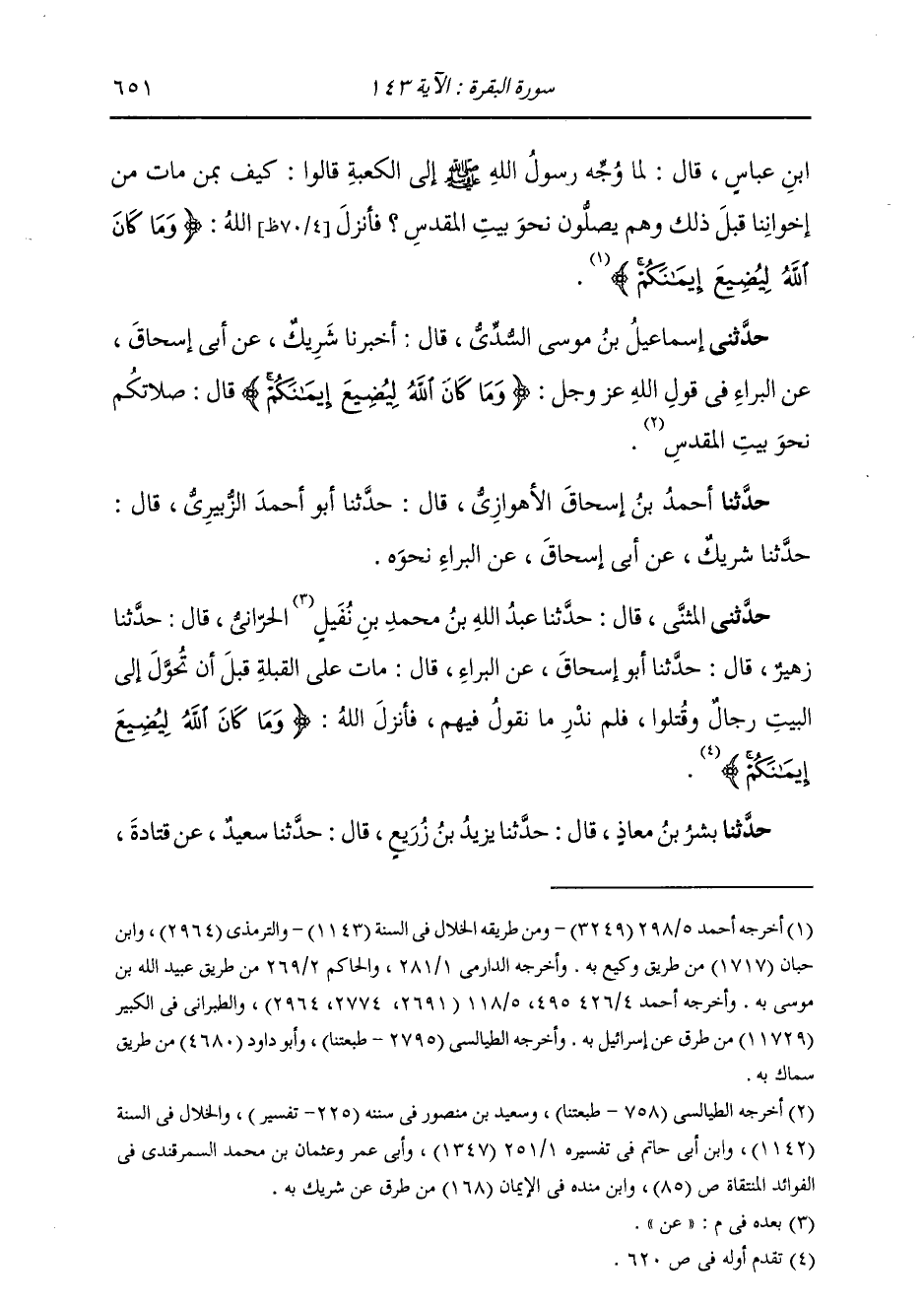 وَحَدَّثَنِي الْمُثَنَّى، قَالَ: ثنا عَبْدُ اللَّهِ بْنُ مُحَمَّدِ بْنِ نُفَيْلٍ، عَنِ الْحَرَّانِيِّ، قَالَ: ثنا زُهَيْرٌ، قَالَ: ثنا أَبُو إِسْحَاقَ، عَنِ الْبَرَاءِ، قَالَ: " مَاتَ عَلَى الْقِبْلَةِ قَبْلَ أَنْ تَحَوَّلَ إِلَى الْبَيْتِ رِجَالٌ وَقَتَلُوا، فَلَمْ نَدْرِ مَا نَقُولُ فِيهِمْ، فَأَنْزَلَ اللَّهُ تَعَالَى ذِكْرُهُ: {§وَمَا كَانَ اللَّهُ لِيُضِيعَ إِيمَانَكُمْ} [البقرة: 143] "