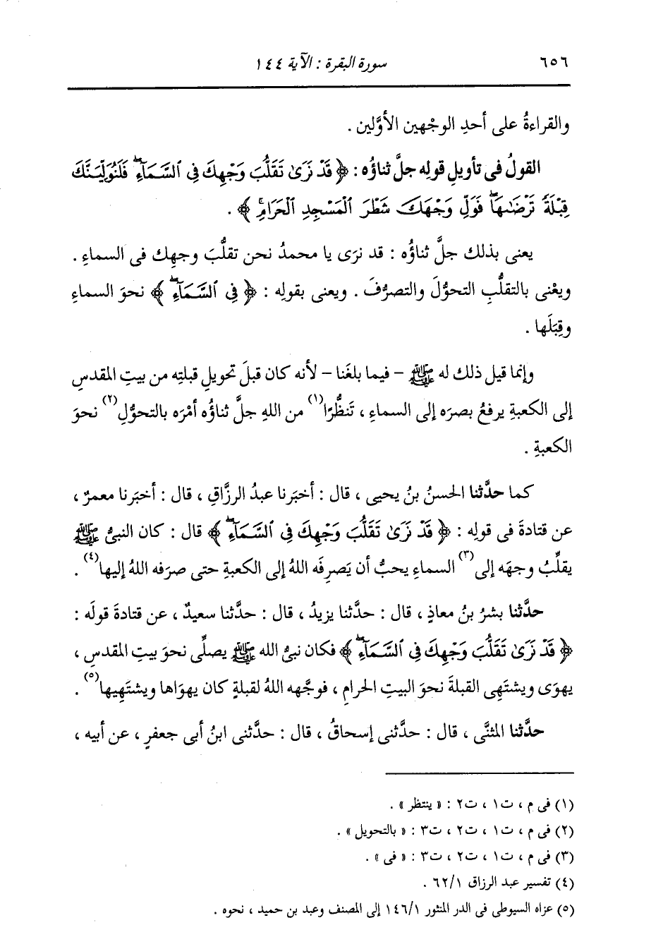 كَمَا حَدَّثَنَا الْحَسَنُ بْنُ يَحْيَى، قَالَ: أَخْبَرَنَا عَبْدُ الرَّزَّاقِ، قَالَ: أَخْبَرَنَا مَعْمَرٌ، عَنْ قَتَادَةَ، فِي قَوْلِهِ: {§قَدْ نَرَى تَقَلُّبَ وَجْهِكَ فِي السَّمَاءِ} [البقرة: 144] قَالَ: «كَانَ صَلَّى اللهُ عَلَيْهِ وَسَلَّمَ يُقَلِّبُ وَجْهَهُ فِي السَّمَاءِ يُحِبُّ أَنْ يَصْرِفَهُ اللَّهُ عَزَّ وَجَلَّ إِلَى الْكَعْبَةِ حَتَّى صَرَفَهُ اللَّهُ إِلَيْهَا»