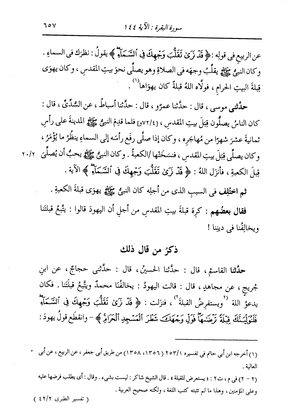 حَدَّثَنِي مُوسَى بْنُ هَارُونَ، قَالَ: ثنا عَمْرُو بْنُ حَمَّادٍ، قَالَ: ثنا أَسْبَاطٌ، عَنِ السُّدِّيِّ، قَالَ: " كَانَ النَّاسُ يُصَلُّونَ قِبَلَ بَيْتِ الْمَقْدِسِ، فَلَمَّا قَدِمَ النَّبِيُّ صَلَّى اللهُ عَلَيْهِ وَسَلَّمَ الْمَدِينَةَ عَلَى رَأْسِ ثَمَانِيَةَ عَشَرَ شَهْرًا مِنْ مُهَاجَرِهِ، كَانَ إِذَا صَلَّى رَفَعَ رَأْسَهُ إِلَى السَّمَاءِ يَنْظُرُ مَا يُؤْمَرُ، وَكَانَ يُصَلِّي قِبَلَ بَيْتِ الْمَقْدِسِ. فَنَسَخَتْهَا الْكَعْبَةُ. فَكَانَ النَّبِيُّ صَلَّى اللهُ عَلَيْهِ وَسَلَّمَ يُحِبُّ أَنْ يُصَلِّيَ قِبَلَ الْكَعْبَةِ فَأَنْزَلَ اللَّهُ جَلَّ ثَنَاؤُهُ: {§قَدْ نَرَى تَقَلُّبَ وَجْهِكَ فِي السَّمَاءِ} [البقرة: 144] الْآيَةَ «ثُمَّ اخْتَلَفَ فِي السَّبَبِ الَّذِي مِنْ أَجْلِهِ كَانَ صَلَّى اللهُ عَلَيْهِ وَسَلَّمَ يَهْوَى قِبْلَةَ الْكَعْبَةِ» قَالَ بَعْضُهُمْ: كَرِهَ قِبْلَةَ بَيْتِ الْمَقْدِسِ، مِنْ أَجْلِ أَنَّ الْيَهُودَ قَالُوا. يَتَّبِعُ قِبْلَتَنَا وَيُخَالِفُنَا فِي دِينِنَا