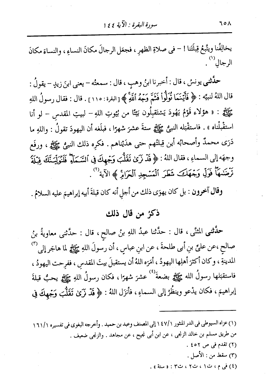 ذِكْرُ مَنْ قَالَ ذَلِكَ حَدَّثَنِي الْمُثَنَّى، قَالَ: ثنا عَبْدُ اللَّهِ بْنُ صَالِحٍ، قَالَ: ثنا مُعَاوِيَةُ بْنُ صَالِحٍ، عَنْ عَلِيِّ بْنِ أَبِي طَلْحَةَ، عَنِ ابْنِ عَبَّاسٍ: أَنَّ رَسُولَ اللَّهِ صَلَّى اللهُ عَلَيْهِ وَسَلَّمَ لَمَّا هَاجَرَ إِلَى الْمَدِينَةِ وَكَانَ أَكْثَرَ أَهْلِهَا الْيَهُودُ أَمَرَهُ اللَّهُ عَزَّ وَجَلَّ أَنْ يَسْتَقْبِلَ بَيْتَ الْمَقْدِسِ، فَفَرِحَتِ الْيَهُودُ، فَاسْتَقْبَلَهَا رَسُولُ اللَّهِ صَلَّى اللهُ عَلَيْهِ وَسَلَّمَ سِتَّةَ عَشَرَ شَهْرًا، فَكَانَ رَسُولُ اللَّهِ صَلَّى اللهُ عَلَيْهِ وَسَلَّمَ يُحِبُّ قِبْلَةَ إِبْرَاهِيمَ، فَكَانَ يَدْعُو وَيَنْظُرُ إِلَى السَّمَاءِ، فَأَنْزَلَ اللَّهُ عَزَّ وَجَلَّ: {§قَدْ نَرَى تَقَلُّبَ وَجْهِكَ فِي -[659]- السَّمَاءِ} [البقرة: 144] الْآيَةَ "