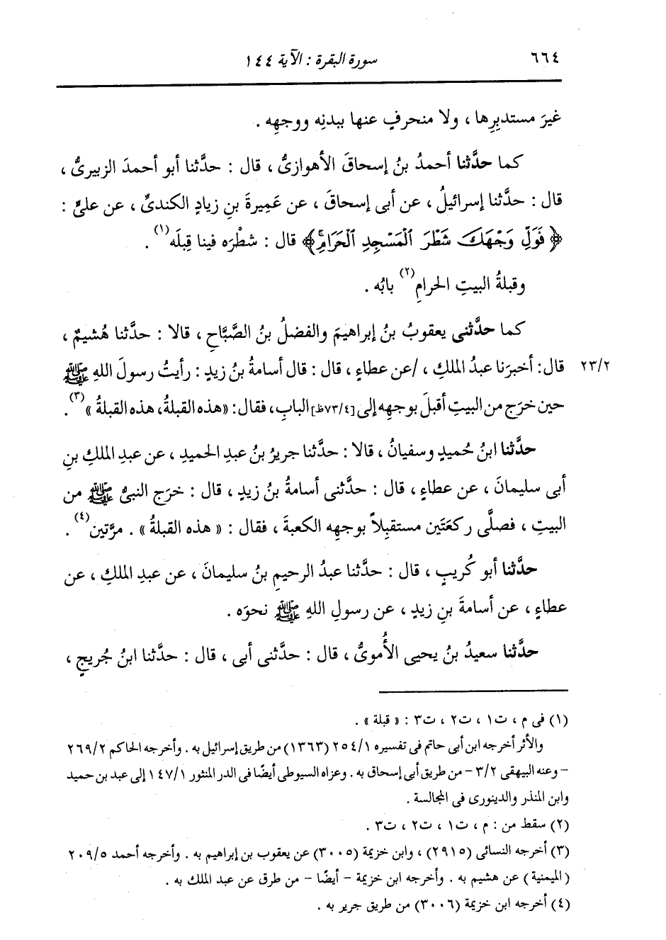 حَدَّثَنَا ابْنُ حُمَيْدٍ، وَسُفْيَانُ بْنُ وَكِيعٍ، قَالَا: ثنا جَرِيرٌ، عَنْ عَبْدِ الْمَلِكِ بْنِ أَبِي سُلَيْمَانَ، عَنْ عَطَاءٍ، قَالَ: حَدَّثَنِي أُسَامَةُ بْنُ زَيْدٍ، قَالَ: " خَرَجَ النَّبِيُّ صَلَّى اللهُ عَلَيْهِ وَسَلَّمَ مِنَ الْبَيْتِ، فَصَلَّى رَكْعَتَيْنِ مُسْتَقْبِلًا بِوَجْهِهِ الْكَعْبَةَ، فَقَالَ: «§هَذِهِ الْقِبْلَةُ» مَرَّتَيْنِ " حَدَّثَنَا أَبُو كُرَيْبٍ، قَالَ: ثنا عَبْدُ الرَّحِيمِ بْنُ سُلَيْمَانَ، عَنْ عَبْدِ الْمَلِكِ، عَنْ عَطَاءٍ، عَنْ أُسَامَةَ بْنِ زَيْدٍ، عَنْ رَسُولِ اللَّهِ صَلَّى اللهُ عَلَيْهِ وَسَلَّمَ نَحْوَهُ