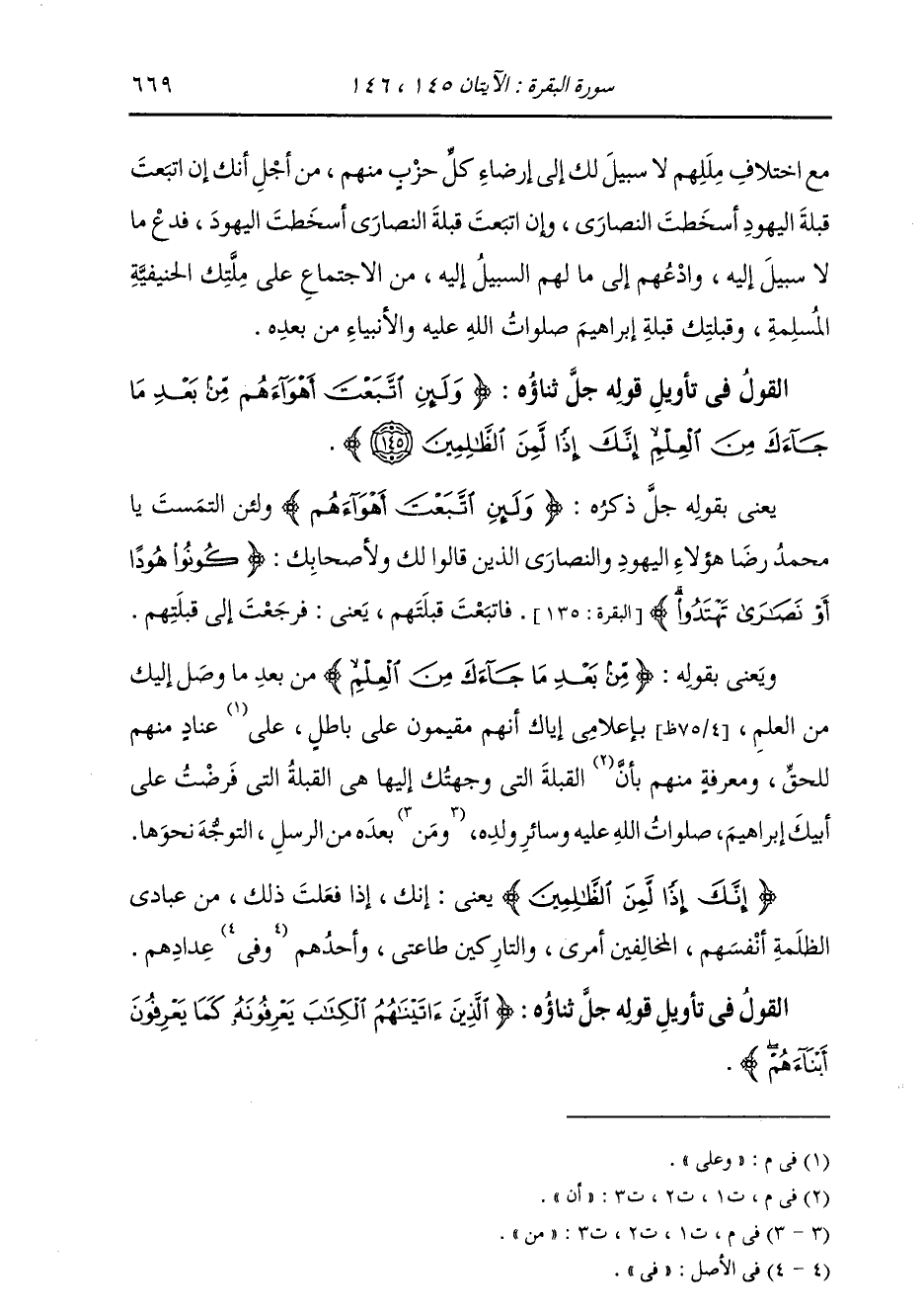 §الْقَوْلِ فِي تَأْوِيلِ قَوْلِهِ تَعَالَي: {وَلَئِنِ اتَّبَعْتَ أَهْوَاءَهُمْ مِنْ بَعْدِ مَا جَاءَكَ مِنَ الْعِلْمِ إِنَّكَ إِذًا لَمِنَ الظَّالِمِينَ} [البقرة: 145] يَعْنِي بِقَوْلِهِ جَلَّ ثَنَاؤُهُ: {وَلَئِنِ اتَّبَعْتَ أَهْوَاءَهُمْ} [البقرة: 120] وَلَئِنِ الْتَمَسْتَ يَا مُحَمَّدُ رِضَا هَؤُلَاءِ الْيَهُودِ، وَالنَّصَارَى الَّذِينَ قَالُوا لَكَ وَلِأَصْحَابِكَ: {كُونُوا هُودًا أَوْ نَصَارَى تَهْتَدُوا} [البقرة: 135] ، فَاتَّبَعْتَ قِبْلَتَهُمْ يَعْنِي فَرَجَعْتَ إِلَى قِبْلَتِهِمْ. ويعني بِقَوْلِهِ: {مِنْ بَعْدِ مَا جَاءَكَ مِنَ الْعِلْمِ} [البقرة: 145] مِنْ بَعْدِ مَا وَصَلَ إِلَيْكَ مِنَ الْعِلْمِ بِإِعْلَامِي إِيَّاكَ أَنَّهُمْ مُقِيمُونَ عَلَى بَاطِلٍ وَعَلَى عِنَادٍ مِنْهُمْ لِلْحَقِّ وَمَعْرِفَةٍ مِنْهُمْ أَنَّ الْقِبْلَةَ الَّتِي وَجَّهْتُكَ إِلَيْهَا هِيَ الْقِبْلَةُ الَّتِي فَرَضْتُ عَلَى أَبِيكَ إِبْرَاهِيمَ عَلَيْهِ السَّلَامُ، وَسَائِرِ وَلَدِهِ مِنْ بَعْدِهِ مِنَ الرُّسُلِ التَّوَجُّهَ نَحْوَهَا؛ {إِنَّكَ إِذًا لَمِنَ الظَّالِمِينَ} [البقرة: 145] يَعْنِي أَنَّكَ إِذَا فَعَلْتَ ذَلِكَ مِنْ عِبَادِي الظَّلَمَةِ أَنْفُسَهُمُ الْمُخَالِفِينَ أَمْرِي، وَالتَّارِكِينَ طَاعَتِي، وَأَحَدُهُمْ، وَفِي عِدَادِهِمْ