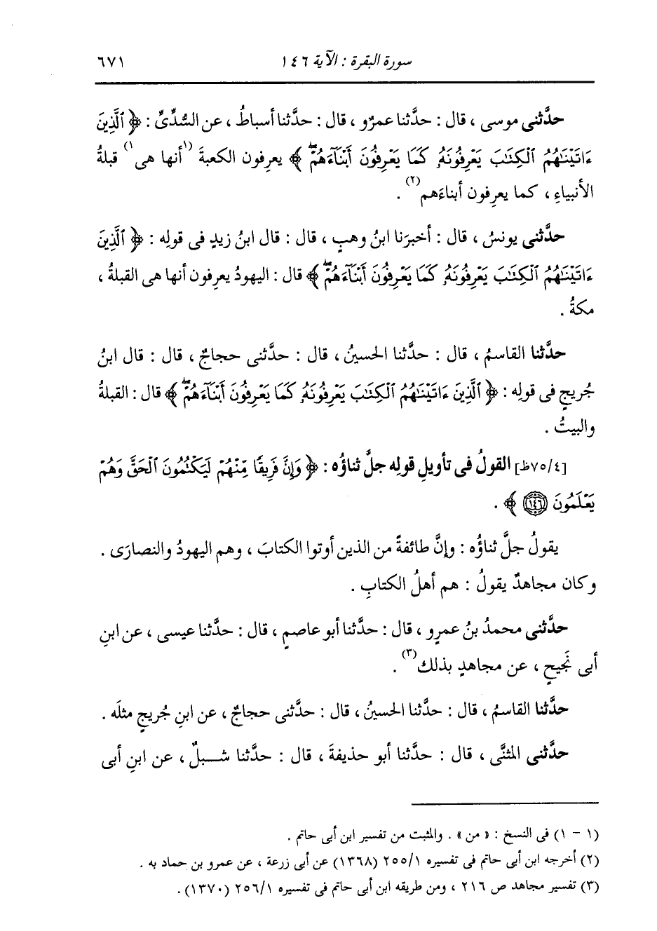 حَدَّثَنَا الْقَاسِمُ، قَالَ: ثنا الْحُسَيْنُ، قَالَ: حَدَّثَنِي حَجَّاجٌ، قَالَ: قَالَ ابْنُ جُرَيْجٍ، فِي قَوْلِهِ: {§الَّذِينَ آتَيْنَاهُمُ الْكِتَابَ يَعْرِفُونَهُ كَمَا يَعْرِفُونَ أَبْنَاءَهُمْ} [البقرة: 146] قَالَ: الْقِبْلَةُ، وَالْبَيْتُ "