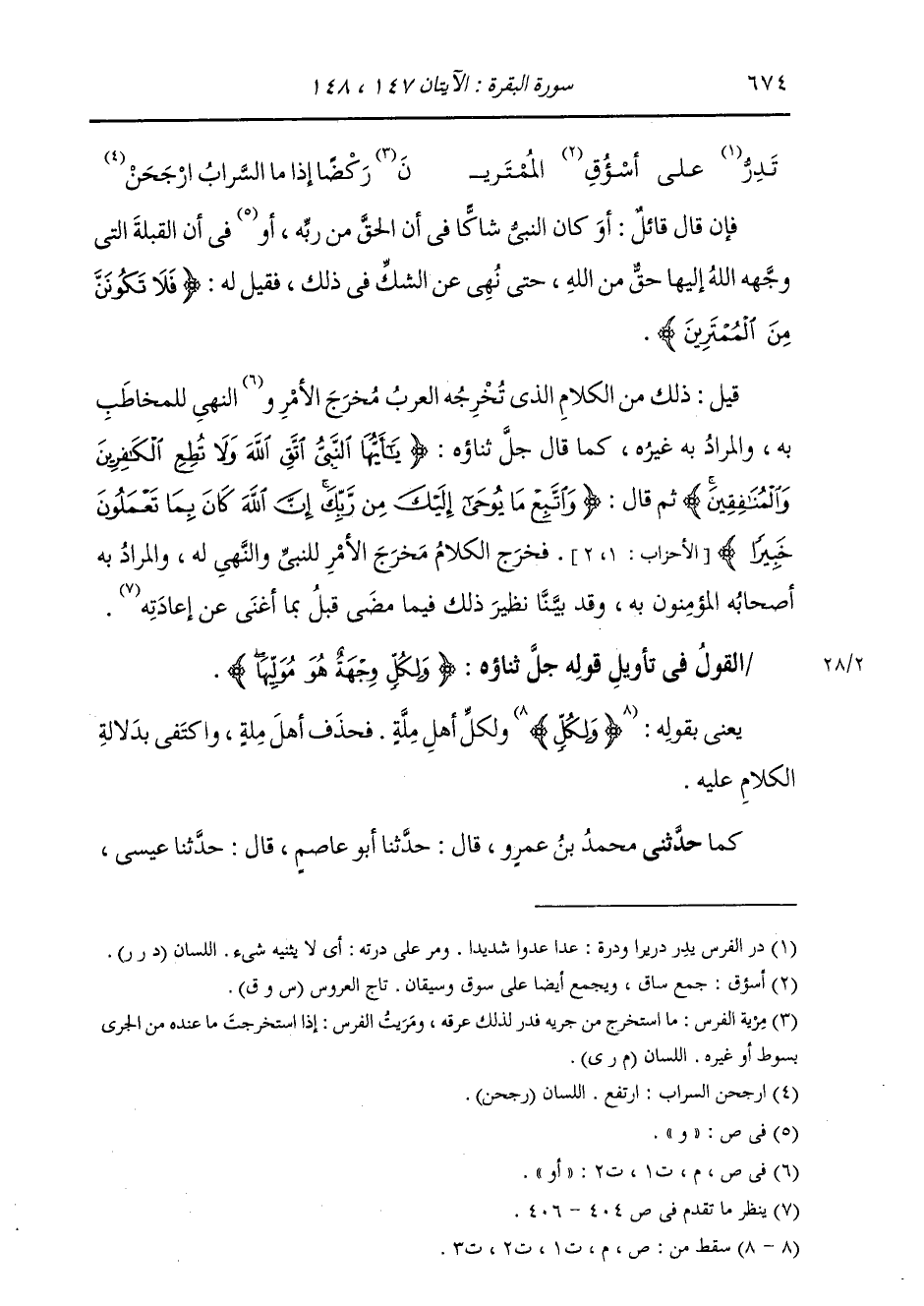 كَمَا حَدَّثَنِي مُحَمَّدُ بْنُ عَمْرٍو، قَالَ: حَدَّثَنَا أَبُو عَاصِمٍ، قَالَ: حَدَّثَنَا عِيسَى، -[675]- عَنِ ابْنِ أَبِي نَجِيحٍ، عَنْ مُجَاهِدٍ، فِي قَوْلِ اللَّهِ عَزَّ وَجَلَّ: {§وَلِكُلٍّ وِجْهَةٌ} [البقرة: 148] قَالَ: لِكُلِّ صَاحِبِ مِلَّةٍ "