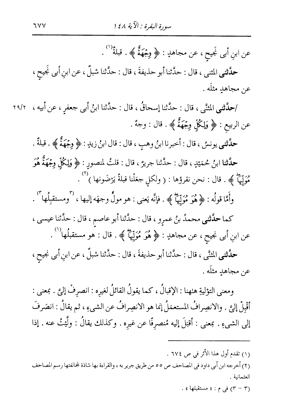 كَمَا حَدَّثَنِي مُحَمَّدُ بْنُ عَمْرٍو، قَالَ: ثنا أَبُو عَاصِمٍ، قَالَ: ثنا عِيسَى، عَنِ ابْنِ أَبِي نَجِيحٍ، عَنْ مُجَاهِدٍ، " {§هُوَ مُوَلِّيهَا} [البقرة: 148] قَالَ: هُوَ مُسْتَقْبِلُهَا " حَدَّثَنِي الْمُثَنَّى، قَالَ: ثنا أَبُو حُذَيْفَةَ، قَالَ: ثنا شِبْلُ، عَنِ ابْنِ أَبِي نَجِيحٍ، عَنْ مُجَاهِدٍ مِثْلَهُ وَمَعْنَى التَّوْلِيَةِ هَا هُنَا الْإِقْبَالُ، كَمَا يَقُولُ الْقَائِلُ لِغَيْرِهِ: انْصَرَفَ إِلَيَّ، بِمَعْنَى أَقْبَلَ إِلَيَّ، وَالِانْصِرَافُ الْمُسْتَعْمَلُ إِنَّمَا هُوَ الِانْصِرَافُ عَنِ الشَّيْءِ، ثُمَّ يُقَالَ: انْصَرَفَ إِلَى الشَّيْءِ بِمَعْنَى أَقْبَلَ إِلَيْهِ مُنْصَرِفًا عَنْ غَيْرِهِ. وَكَذَلِكَ يُقَالَ: وَلَّيْتُ عَنْهُ: إِذَا