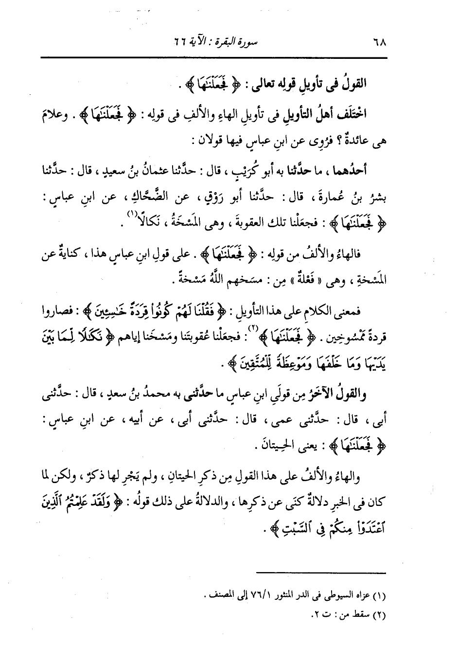§الْقَوْلُ فِي تَأْوِيلِ قَوْلِهِ تَعَالَى: {فَجَعَلْنَاهَا نَكَالًا لِمَا بَيْنَ يَدَيْهَا وَمَا خَلْفَهَا وَمَوْعِظَةً لِلْمُتَّقِينَ} [البقرة: 66] اخْتَلَفَ أَهْلُ التَّأْوِيلِ فِي تَأْوِيلِ الْهَاءِ وَالْأَلِفِ فِي قَوْلِهِ: {فَجَعَلْنَاهَا} [البقرة: 66] وَعَلَامَ هِيَ عَائِدَةٌ، فَرُوِيَ عَنِ ابْنِ عَبَّاسٍ فِيهَا قَوْلَانِ