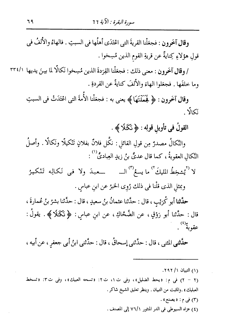 حَدَّثَنِي الْمُثَنَّى، قَالَ: حَدَّثَنِي إِسْحَاقُ، قَالَ: حَدَّثَنِي ابْنُ أَبِي جَعْفَرٍ، عَنْ أَبِيهِ، -[70]- عَنِ الرَّبِيعِ: " فِي قَوْلِهِ: {§فَجَعَلْنَاهَا نَكَالًا} [البقرة: 66] أَيْ عُقُوبَةً "