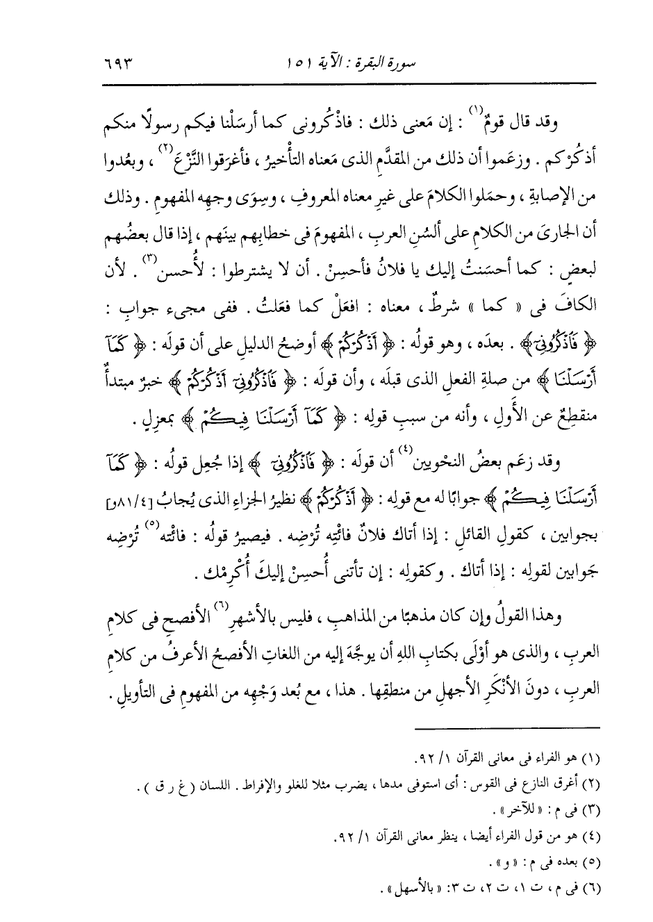 } [البقرة: 151] مُتَعَلِّقًا بِقَوْلِهِ: {فَاذْكُرُونِي أَذْكُرْكُمْ} [البقرة: 152] وَقَدْ قَالَ قَوْمٌ: إِنَّ مَعْنَى ذَلِكَ: فَاذْكُرُونِي كَمَا أَرْسَلْنَا فِيكُمْ رَسُولًا مِنْكُمْ أَذْكُرْكُمْ. وَزَعَمُوا أَنَّ ذَلِكَ مِنَ الْمُقَدَّمِ الَّذِي مَعْنَاهُ التَّأْخِيرُ، فَأَغْرَقُوا النَّزْعَ، وَبَعُدُوا مِنَ الْإِصَابَةِ، وَحَمَلُوا الْكَلَامَ عَلَى غَيْرِ مَعْنَاهُ الْمَعْرُوفِ وَسَوِيِّ وَجْهِهِ الْمَفْهُومِ. وَذَلِكَ أَنَّ الْجَارِيَ مِنَ الْكَلَامِ عَلَى أَلْسُنِ الْعَرَبِ الْمَفْهُومِ فِي خِطَابِهِمْ بَيْنَهُمْ إِذَا قَالَ بَعْضُهُمْ لِبَعْضٍ: «كَمَا أَحْسَنْتُ إِلَيْكَ يَا فُلَانُ فَأَحْسِنْ» أَنْ لَا يَشْتَرِطُوا لِلْآخَرَ، لِأَنَّ الْكَافَ فِي «كَمَا» شَرْطٌ مَعْنَاهُ: افْعَلْ كَمَا فَعَلْتُ، فَفِي مَجِيءِ جَوَابِ: {فَاذْكُرُونِي} [البقرة: 152] بَعْدَهُ وَهُوَ قَوْلُهُ: {أَذْكُرْكُمْ} [البقرة: 152] أَوْضَحُ دَلِيلٍ عَلَى أَنَّ قَوْلَهُ: {كَمَا أَرْسَلْنَا} [البقرة: 151] مِنْ صِلَةِ الْفِعْلِ الَّذِي قَبْلَهُ، وَأَنَّ قَوْلَهُ: {فَاذْكُرُونِي أَذْكُرْكُمْ} [البقرة: 152] خَبَرُ مُبْتَدَأٍ مُنْقَطِعٌ عَنِ الْأَوَّلِ، وَأَنَّهُ مِنْ سَبَبِ قَوْلِهِ: {كَمَا أَرْسَلْنَا فِيكُمْ} [البقرة: 151] بِمَعْزَلٍ. وَقَدْ زَعَمَ بَعْضُ النَّحْوِيِّينَ أَنَّ قَوْلَهُ: {فَاذْكُرُونِي} [البقرة: 152] إِذَا جَعَلَ قَوْلَهُ: {كَمَا أَرْسَلْنَا فِيكُمْ} [البقرة: 151] جَوَابًا لَهُ مَعَ قَوْلِهِ: {أَذْكُرْكُمْ} [البقرة: 152] نَظِيرَ الْجَزَاءِ الَّذِي يُجَابُ بِجَوَابَيْنِ، كَقَوْلِ الْقَائِلِ: إِذَا أَتَاكَ فُلَانٌ فَأْتِهِ تَرْضَهُ، فَيَصِيرُ قَوْلُهُ «فَأْتِهِ» وَ «تَرْضَهَ» جَوَابَيْنِ لِقَوْلِهِ: إِذَا أَتَاكَ، وَكَقَوْلِهِ: إِنْ تَأْتِنِي أُحْسِنْ إِلَيْكَ أُكْرِمْكَ. وَهَذَا الْقَوْلُ وَإِنْ كَانَ مَذْهَبًا مِنَ الْمَذَاهِبِ، فَلَيْسَ بِالْأَسْهَلِ الْأَفْصَحِ فِي كَلَامِ الْعَرَبِ. وَالَّذِي هُوَ أَوْلَى بِكِتَابِ اللَّهِ عَزَّ وَجَلَّ أَنْ يُوَجَّهَ إِلَيْهِ مِنَ اللُّغَاتِ الْأَفْصَحِ الْأَعْرَفِ مِنْ كَلَامِ الْعَرَبِ دُونَ الْأَنْكَرِ الْأَجْهَلِ مِنْ مَنْطِقِهَا هَذَا مَعَ بُعْدِ وَجْهِهِ مِنَ الْمَفْهُومِ فِي التَّأْوِيلِ