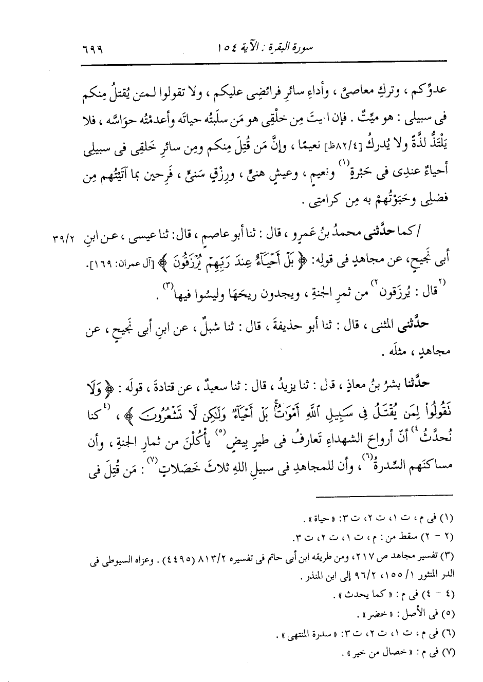 حَدَّثَنَا بِشْرُ بْنُ مُعَاذٍ، قَالَ: ثنا يَزِيدُ، قَالَ: ثنا سَعِيدٌ، عَنْ قَتَادَةَ، قَوْلِهِ {§وَلَا تَقُولُوا لِمَنْ يُقْتَلُ فِي سَبِيلِ اللَّهِ أَمْوَاتٌ بَلْ أَحْيَاءٌ وَلَكِنْ لَا تَشْعُرُونَ} [البقرة: 154] " كُنَّا نُحَدِّثُ أَنَّ أَرْوَاحَ الشُّهَدَاءِ تَعَارَفَ فِي طَيْرِ بِيضٍ يَأْكُلْنَ مِنْ ثِمَارِ الْجَنَّةِ، وَأَنَّ مَسَاكِنَهُمْ سِدْرَةُ الْمُنْتَهَى، وَأَنَّ لِلْمُجَاهِدِ فِي سَبِيلِ اللَّهِ ثَلَاثَ خِصَالٍ مِنَ الْخَيْرِ: مَنْ قُتِلَ فِي -[700]- سَبِيلِ اللَّهِ مِنْهُمْ صَارَ حَيًّا مَرْزُوقًا، وَمَنْ غُلِبَ آتَاهُ اللَّهُ أَجْرًا عَظِيمًا، وَمَنْ مَاتَ رَزَقَهُ اللَّهُ رِزْقًا حَسَنًا "