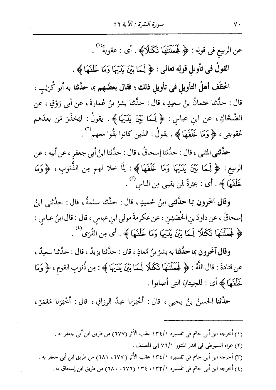 حَدَّثَنِي الْمُثَنَّى، قَالَ: حَدَّثَنَا إِسْحَاقُ، قَالَ: حَدَّثَنَا ابْنُ أَبِي جَعْفَرٍ، عَنْ أَبِيهِ، عَنِ الرَّبِيعِ: " {§لِمَا بَيْنَ يَدَيْهَا وَمَا خَلْفَهَا} [البقرة: 66] لِمَا خَلَا لَهُمْ مِنَ الذُّنُوبِ {وَمَا خَلْفَهَا} [البقرة: 66] أَيْ عِبْرَةً لِمَنْ بَقِيَ مِنَ النَّاسِ "