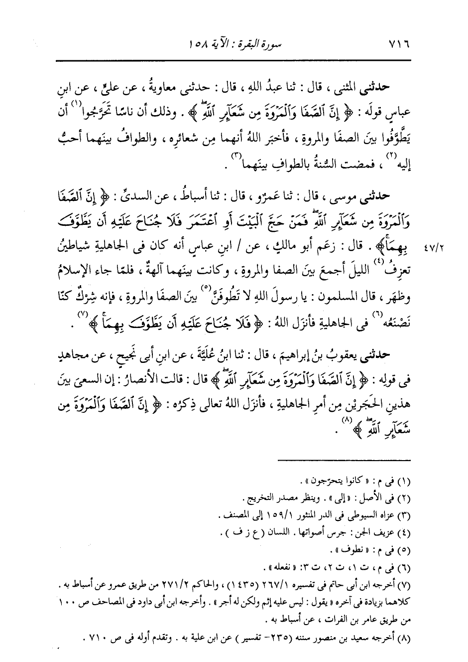حَدَّثَنِي الْمُثَنَّى، قَالَ: ثنا عَبْدُ اللَّهِ بْنُ صَالِحٍ، قَالَ: حَدَّثَنِي مُعَاوِيَةُ بْنُ صَالِحٍ، عَنْ عَلِيِّ بْنِ أَبِي طَلْحَةَ، عَنِ ابْنِ عَبَّاسٍ، قَوْلَهُ " {§إِنَّ الصَّفَا وَالْمَرْوَةَ مِنْ شَعَائِرِ اللَّهِ} [البقرة: 158] وَذَلِكَ أَنَّ نَاسًا كَانُوا يَتَحَرَّجُونَ أَنْ يَطُوفُوا بَيْنَ الصَّفَا وَالْمَرْوَةِ، فَأَخْبَرَ اللَّهُ أَنَّهُمَا مِنْ شَعَائِرِهِ، وَالطَّوَافُ بَيْنَهُمَا أَحَبُّ إِلَيْهِ، فَمَضَتِ السُّنَّةُ بِالطَّوَافِ بَيْنَهُمَا "