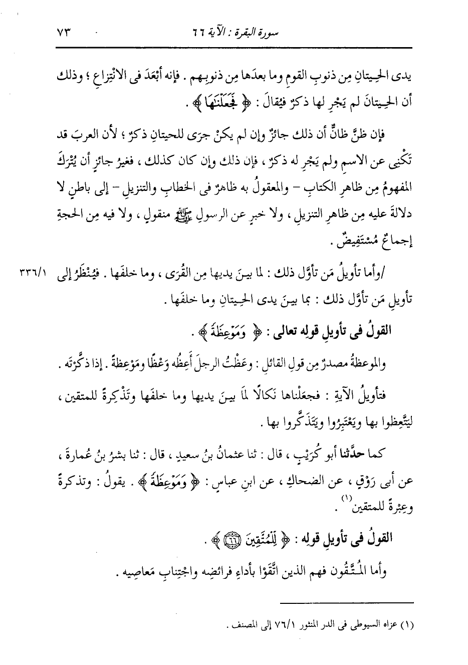 §الْقَوْلُ فِي تَأْوِيلِ قَوْلِهِ تَعَالَى: {وَمَوْعِظَةً} [البقرة: 66] وَالْمَوْعِظَةُ مَصْدَرٌ مِنْ قَوْلِ الْقَائِلِ: وَعَظْتُ الرَّجُلَ أَعِظُهُ وَعْظًا وَمَوْعِظَةً: إِذَا ذَكَرْتُهُ فَتَأْوِيلُ الْآيَةِ: فَجَعَلْنَاهَا نَكَالًا لِمَا بَيْنَ يَدَيْهَا وَمَا خَلْفَهَا، وَتَذْكِرَةً لِلْمُتَّقِينَ، لِيَتَّعِظُوا بِهَا، وَيَعْتَبِرُوا، وَيَتَذَكَّرُوا بِهَا