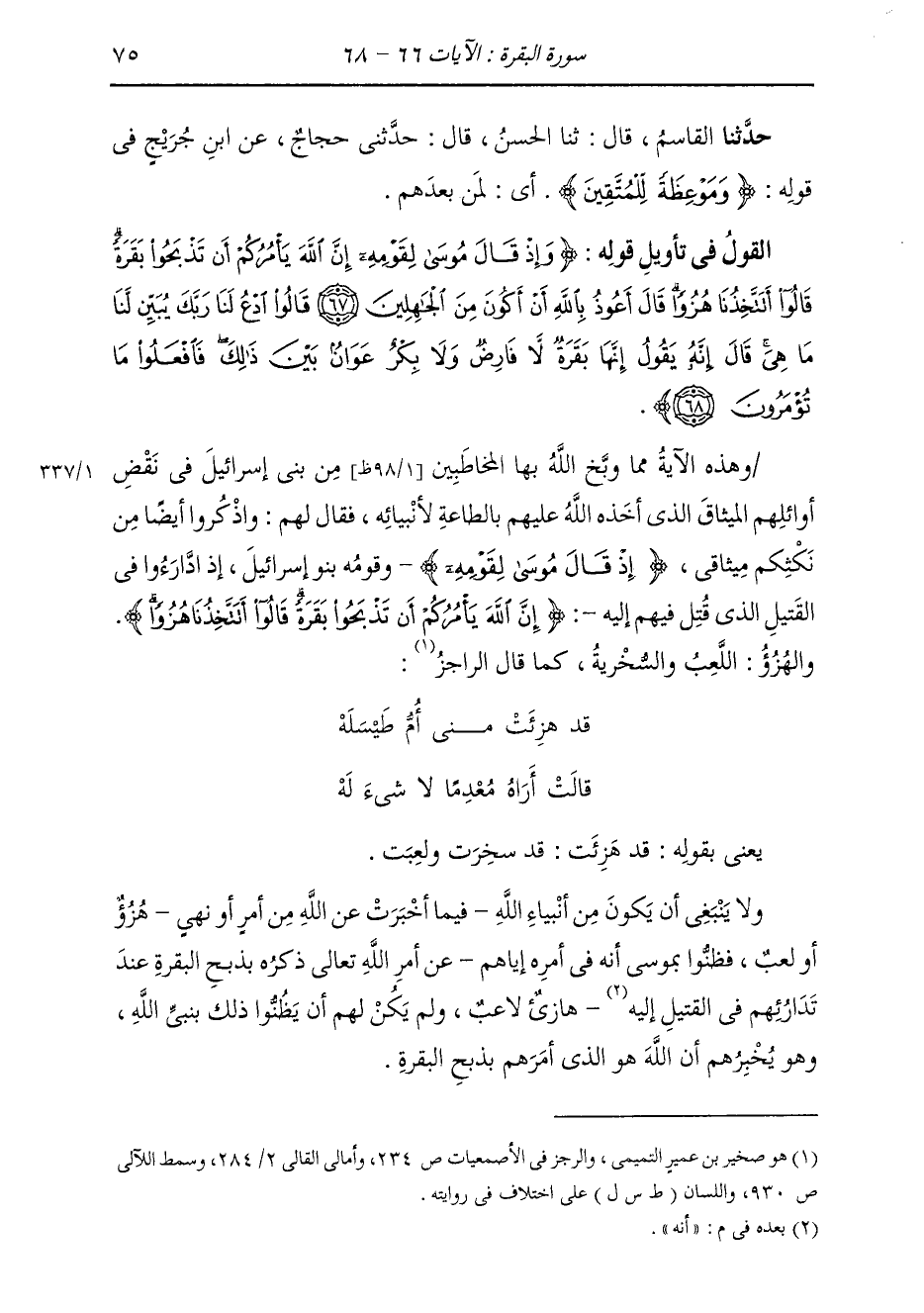 §الْقَوْلُ فِي تَأْوِيلِ قَوْلِهِ تَعَالَى: {وَإِذْ قَالَ مُوسَى لِقَوْمِهِ إِنَّ اللَّهَ يَأْمُرُكُمْ أَنْ تَذْبَحُوا بَقَرَةً قَالُوا أَتَتَّخِذُنَا هُزُوًا قَالَ أَعُوذُ بِاللَّهِ أَنْ أَكُونَ مِنَ الْجَاهِلِينَ قَالُوا ادْعُ لَنَا رَبَّكَ يُبَيِّنْ لَنَا مَا هِيَ قَالَ إِنَّهُ يَقُولُ إِنَّهَا بَقَرَةٌ لَا فَارِضٌ وَلَا بِكْرٌ عَوَانٌ بَيْنَ ذَلِكَ فَافْعَلُوا مَا تُؤْمَرُونَ} [البقرة: 68] وَهَذِهِ الْآيَةُ مِمَّا وَبَّخَ اللَّهُ بِهَا الْمُخَاطَبِينَ مِنْ بَنِي إِسْرَائِيلَ فِي نَقْضِ أَوَائِلِهِمُ الْمِيثَاقَ الَّذِي أَخَذَهُ اللَّهُ عَلَيْهِمْ بِالطَّاعَةِ لِأَنْبِيَائِهِ، فَقَالَ لَهُمْ: وَاذْكُرُوا أَيْضًا مِنْ نَكْثِكُمْ مِيثَاقِي، إِذْ قَالَ مُوسَى لِقَوْمِهِ، وَقَوْمُهُ بَنُو إِسْرَائِيلَ، إِذِ ادَّارَءُوا فِي الْقَتِيلِ الَّذِي قُتِلَ فِيهِمْ إِلَيْهِ: {إِنَّ اللَّهَ يَأْمُرُكُمْ أَنْ تَذْبَحُوا بَقَرَةً قَالُوا أَتَتَّخِذُنَا هُزُوًا} [البقرة: 67] وَالْهُزُوُ: اللَّعِبُ وَالسُّخْرِيَةُ كَمَا قَالَ الرَّاجِزُ: