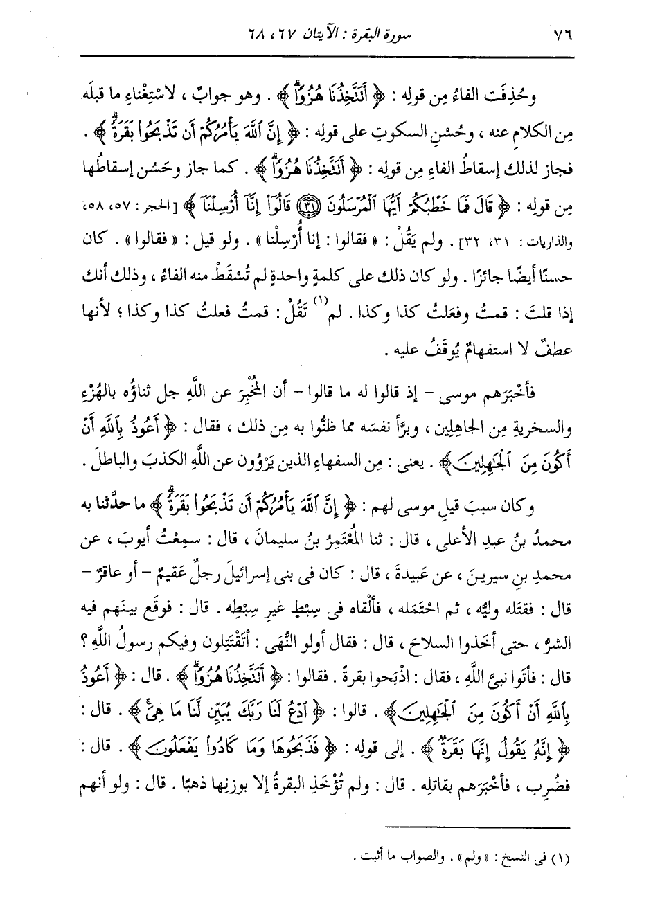 وَحُذِفَتِ الْفَاءُ مِنْ قَوْلِهِ: {أَتَتَّخِذُنَا هُزُوًا} [البقرة: 67] وَهُوَ جَوَابٌ، لِاسْتِغْنَاءِ مَا قَبْلَهُ مِنَ الْكَلَامِ عَنْهُ، وَحَسُنَ السُّكُوتُ عَلَى قَوْلِهِ: {إِنَّ اللَّهَ يَأْمُرُكُمْ أَنْ تَذْبَحُوا بَقَرَةً} [البقرة: 67] فَجَازَ لِذَلِكَ إِسْقَاطُ الْفَاءِ مِنْ قَوْلِهِ: {أَتَتَّخِذُنَا هُزُوًا} [البقرة: 67] كَمَا جَازَ وَحَسُنَ إِسْقَاطُهَا مِنْ قَوْلِهِ تَعَالَى: {قَالَ فَمَا خَطْبُكُمْ أَيُّهَا الْمُرْسَلُونَ قَالُوا إِنَّا أُرْسِلْنَا} [الحجر: 57] وَلَمْ يَقُلْ: فَقَالُوا إِنَّا أُرْسِلْنَا، وَلَوْ قِيلَ: فَقَالُوا، كَانَ حَسَنًا أَيْضًا جَائِزًا، وَلَوْ كَانَ ذَلِكَ عَلَى كَلِمَةٍ وَاحِدَةٍ لَمْ تَسْقُطْ مِنْهُ الْفَاءُ؛ وَذَلِكَ أَنَّكَ إِذَا قُلْتَ قُمْتَ وَفَعَلْتَ كَذَا وَكَذَا وَلَمْ تَقُلْ: قُمْتَ فَعَلْتَ كَذَا وَكَذَا، لِأَنَّهَا عَطْفٌ لَا اسْتِفْهَامٌ يُوقَفُ عَلَيْهِ، فَأَخْبَرَهُمْ مُوسَى إِذْ قَالُوا لَهُ مَا قَالُوا إِنَّ الْمُخْبِرَ عَنِ اللَّهِ جَلَّ ثَنَاؤُهُ بِالْهُزْءِ وَالسُّخْرِيَةِ مِنَ الْجَاهِلِينَ وَبَرَّأَ نَفْسَهُ مِمَّا ظَنُّوا بِهِ مِنْ ذَلِكَ، فَقَالَ: {أَعُوذُ بِاللَّهِ أَنْ أَكُونَ مِنَ الْجَاهِلِينَ} [البقرة: 67] يَعْنِي مِنَ السُّفَهَاءِ الَّذِينَ يَرْوُونَ عَنِ اللَّهِ الْكَذِبَ وَالْبَاطِلَ. وَكَانَ سَبَبُ قِيلِ مُوسَى لَهُمْ: {إِنَّ اللَّهَ يَأْمُرُكُمْ أَنْ تَذْبَحُوا بَقَرَةً} [البقرة: 67]
