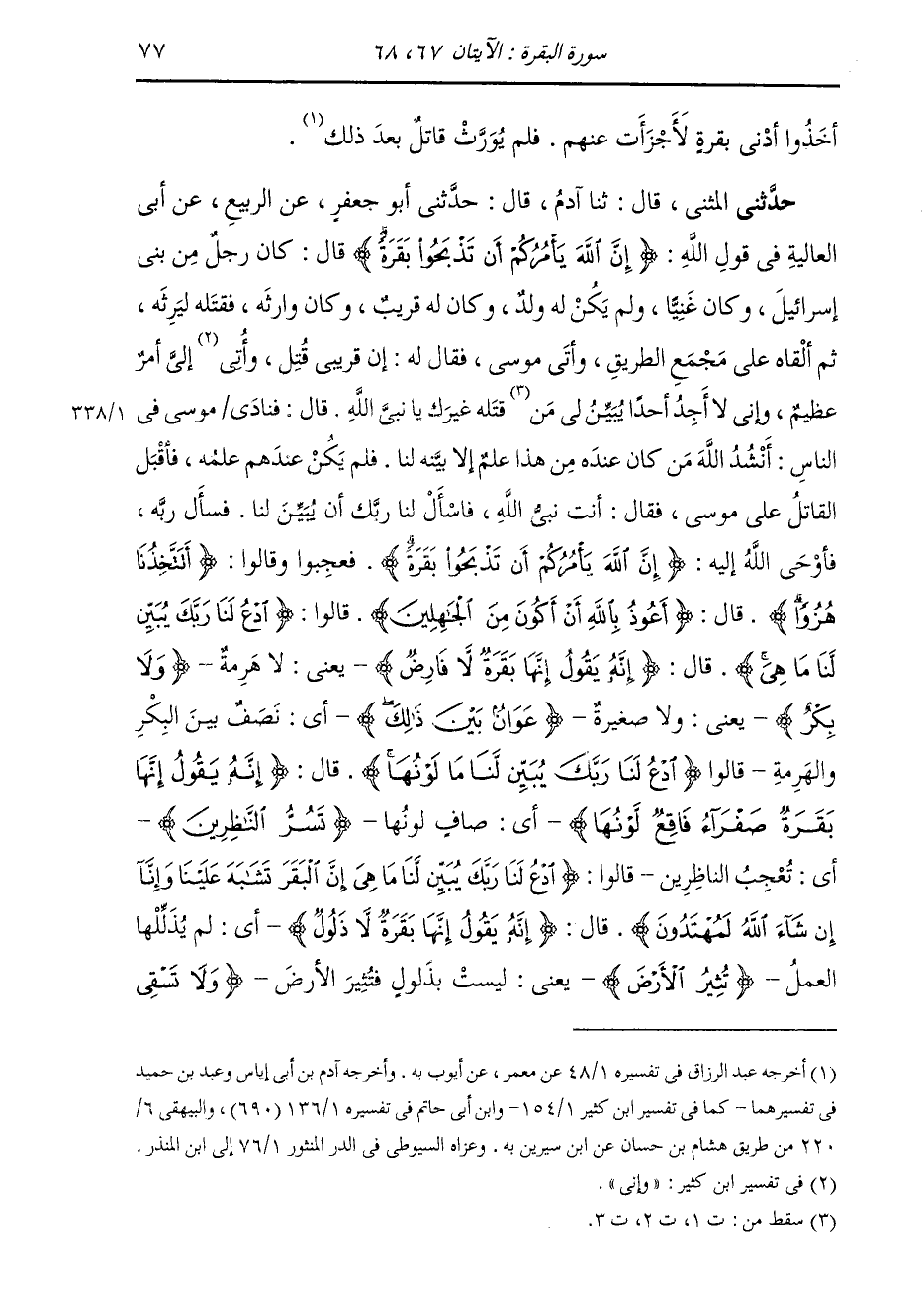 وَحَدَّثَنِي الْمُثَنَّى، قَالَ: ثنا آدَمَ، قَالَ: حَدَّثَنِي أَبُو جَعْفَرٍ، عَنِ الرَّبِيعِ، عَنْ أَبِي الْعَالِيَةِ: " فِي قَوْلِ اللَّهِ {إِنَّ اللَّهَ يَأْمُرُكُمْ أَنْ تَذْبَحُوا بَقَرَةً} [البقرة: 67] قَالَ: §كَانَ رَجُلٌ مِنْ بَنِي إِسْرَائِيلَ، وَكَانَ غَنِيًّا وَلَمْ يَكُنْ لَهُ وَلَدٌ، وَكَانَ لَهُ قَرِيبٌ وَكَانَ وَارِثَهُ، فَقَتَلَهُ لِيَرِثَهُ، ثُمَّ أَلْقَاهُ عَلَى مَجْمَعِ الطَّرِيقِ، وَأَتَى مُوسَى، فَقَالَ لَهُ: إِنَّ قَرِيبِي قُتِلَ، وَأَتَى إِلَيَّ أَمْرٌ عَظِيمٌ، وَإِنِّي لَا أَجِدُ أَحَدًا يُبَيِّنُ لِي مَنْ قَتَلَهُ غَيْرَكَ يَا نَبِيَّ اللَّهِ. قَالَ: فَنَادَى مُوسَى فِي النَّاسِ: أَنْشُدُ اللَّهَ مَنْ كَانَ عِنْدَهُ مِنْ هَذَا عِلْمٍ إِلَّا بَيَّنَهُ لَنَا. فَلَمْ يَكُنْ عِنْدَهُمْ عِلْمُهُ، فَأَقْبَلَ الْقَاتِلُ عَلَى مُوسَى فَقَالَ: أَنْتَ نَبِيُّ اللَّهِ، فَاسْأَلْ لَنَا رَبَّكَ أَنْ يُبَيِّنَ لَنَا. فَسَأَلَ رَبَّهُ فَأَوْحَى اللَّهُ إِلَيْهِ: {إِنَّ اللَّهَ يَأْمُرُكُمْ أَنْ تَذْبَحُوا بَقَرَةً} [البقرة: 67] فَعَجِبُوا وَقَالُوا: {أَتَتَّخِذُنَا هُزُوًا قَالَ أَعُوذُ بِاللَّهِ أَنْ أَكُونَ مِنَ الْجَاهِلِينَ قَالُوا ادْعُ لَنَا رَبَّكَ يُبَيِّنْ لَنَا مَا هِيَ قَالَ إِنَّهُ يَقُولُ إِنَّهَا بَقَرَةٌ لَا فَارِضٌ} [البقرة: 68] يَعْنِي هَرِمَةٌ {وَلَا بِكْرٌ} [البقرة: 68] يَعْنِي وَلَا صَغِيرَةٌ {عَوَانٌ بَيْنَ ذَلِكَ} [البقرة: 68] أَيْ نِصْفٌ بَيْنَ الْبِكْرِ وَالْهَرِمَةِ {قَالُوا ادْعُ لَنَا رَبَّكَ يُبَيِّنْ لَنَا مَا لَوْنُهَا قَالَ إِنَّهُ يَقُولُ إِنَّهَا بَقَرَةٌ صَفْرَاءُ فَاقِعٌ لَوْنُهَا} [البقرة: 69] أَيْ صَافٍ لَوْنُهَا {تَسُرُّ النَّاظِرِينَ} [البقرة: 69] أَيْ تُعْجِبُ النَّاظِرِينَ {قَالُوا ادْعُ لَنَا رَبَّكَ يُبَيِّنْ لَنَا مَا هِيَ إِنَّ الْبَقَرَ تَشَابَهَ عَلَيْنَا وَإِنَّا إِنْ شَاءَ اللَّهُ لَمُهْتَدُونَ قَالَ إِنَّهُ يَقُولُ إِنَّهَا بَقَرَةٌ لَا ذَلُولٌ} [البقرة: 70] أَيْ لَمْ يُذَلِّلْهَا الْعَمَلُ {تُثِيرُ الْأَرْضَ} [البقرة: 71] يَعْنِي لَيْسَتْ بِذَلُولٍ فَتُثِيرُ الْأَرْضَ {وَلَا تَسْقِي