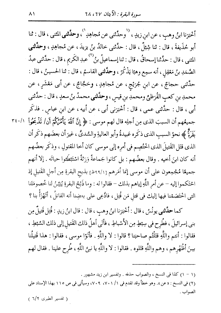 أَخْبَرَنَا ابْنُ وَهْبٍ، عَنِ ابْنِ زَيْدٍ، عَنْ مُجَاهِدٍ، وَحَدَّثَنِي الْمُثَنَّى، قَالَ: ثنا أَبُو حُذَيْفَةَ، قَالَ: ثنا شِبْلٌ، قَالَ: حَدَّثَنِي خَالِدُ بْنُ يَزِيدَ، عَنْ مُجَاهِدٍ، وَحَدَّثَنِي الْمُثَنَّى، قَالَ: حَدَّثَنَا إِسْحَاقُ، قَالَ: ثنا إِسْمَاعِيلُ، عَنْ عَبْدِ الْكَرِيمِ، قَالَ: حَدَّثَنِي عَبْدُ الصَّمَدِ بْنُ مَعْقِلٍ، أَنَّهُ سَمِعَ وَهْبًا، يَذْكُرُ. وَحَدَّثَنِي الْقَاسِمُ، قَالَ: ثنا الْحُسَيْنُ، قَالَ: حَدَّثَنِي حَجَّاجٌ، عَنِ ابْنِ جُرَيْجٍ، عَنْ مُجَاهِدٍ، وَحَجَّاجٍ، عَنْ أَبِي مَعْشَرٍ، عَنْ مُحَمَّدِ بْنِ كَعْبٍ الْقُرَظِيِّ، وَمُحَمَّدِ بْنِ قَيْسٍ، وَحَدَّثَنِي مُحَمَّدُ بْنُ سَعْدٍ، قَالَ: حَدَّثَنِي أَبِي، قَالَ: حَدَّثَنِي عَمِّي، قَالَ: أَخْبَرَنِي أَبِي، عَنْ أَبِيهِ، عَنِ ابْنِ عَبَّاسٍ. فَذَكَرَ جَمِيعُهُمْ: " أَنَّ السَّبَبَ الَّذِي مِنْ أَجْلِهِ قَالَ لَهُمْ مُوسَى: {إِنَّ اللَّهَ يَأْمُرُكُمْ أَنْ تَذْبَحُوا بَقَرَةً} [البقرة: 67] نَحْوُ السَّبَبِ الَّذِي ذَكَرَهُ عُبَيْدَةُ وَأَبُو الْعَالِيَةِ وَالسُّدِّيُّ غَيْرَ أَنَّ بَعْضَهُمْ ذَكَرَ أَنَّ الَّذِيَ قَتَلَ الْقَتِيلَ الَّذِي اخْتَصَمَ فِي أَمْرِهِ إِلَى مُوسَى كَانَ أَخَا الْمَقْتُولِ. وَذَكَرَ بَعْضُهُمْ أَنَّهُ كَانَ ابْنَ أَخِيهِ. وَقَالَ بَعْضُهُمْ: بَلْ كَانُوا جَمَاعَةً وَرَثَةً اسْتَبْطَئُوا حَيَاتَهُ. إِلَّا أَنَّهُمْ جَمِيعًا مُجْمِعُونَ عَلَى أَنَّ مُوسَى إِنَّمَا أَمَرَهُمْ بِذِبْحِ الْبَقَرَةِ مِنْ أَجْلِ الْقَتِيلِ إِذِ احْتَكَمُوا إِلَيْهِ. عَنْ أَمْرِ اللَّهِ إِيَّاهُمْ بِذَلِكَ، فَقَالُوا لَهُ: وَمَا ذَبْحُ الْبَقَرَةِ يُبَيِّنُ لَنَا خُصُومَتَنَا الَّتِي اخْتَصَمْنَا فِيهَا إِلَيْكَ فِي قَتْلِ مَنْ قَتَلَ فَادَّعَى عَلَى بَعْضِنَا أَنَّهُ الْقَاتِلُ أَتَهْزَأُ بِنَا؟