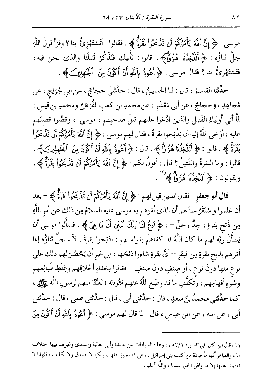 حَدَّثَنَا الْقَاسِمُ، قَالَ: ثنا الْحُسَيْنُ، قَالَ: حَدَّثَنِي حَجَّاجٌ، عَنِ ابْنِ جُرَيْجٍ، عَنْ مُجَاهِدٍ، وَحَجَّاجٍ، عَنْ أَبِي مَعْشَرٍ، عَنْ مُحَمَّدِ بْنِ كَعْبٍ الْقُرَظِيِّ، وَمُحَمَّدِ بْنِ قَيْسٍ: " §لَمَّا أَتَى أَوْلِيَاءُ الْقَتِيلِ وَالَّذِينَ ادَّعَوْا عَلَيْهِمْ قَتْلَ صَاحِبِهِمْ مُوسَى وَقَصُّوا قِصَّتَهُمْ عَلَيْهِ، أَوْحَى اللَّهُ إِلَيْهِ أَنْ يَذْبَحُوا بَقَرَةً، فَقَالَ لَهُمْ مُوسَى: {إِنَّ اللَّهَ يَأْمُرُكُمْ أَنْ تَذْبَحُوا بَقَرَةً قَالُوا أَتَتَّخِذُنَا هُزُوًا قَالَ أَعُوذُ بِاللَّهِ أَنْ أَكُونَ مِنَ الْجَاهِلِينَ} [البقرة: 67] قَالُوا: وَمَا الْبَقَرَةُ وَالْقَتِيلُ؟ قَالَ: أَقُولُ لَكُمْ إِنَّ اللَّهَ يَأْمُرُكُمْ أَنْ تَذْبَحُوا بَقَرَةً، وَتَقُولُونَ: أَتَتَّخِذُنَا هُزُوًا " قَالَ أَبُو جَعْفَرٍ: فَقَالَ الَّذِينَ قِيلَ لَهُمْ: {إِنَّ اللَّهَ يَأْمُرُكُمْ أَنْ تَذْبَحُوا بَقَرَةً} [البقرة: 67] بَعْدَ أَنْ عَلِمُوا وَاسْتَقَرَّ عِنْدَهُمْ أَنَّ الَّذِيَ أَمَرَهُمْ بِهِ مُوسَى عَلَيْه السَّلَامُ مِنْ ذَلِكَ عَنْ أَمْرِ اللَّهِ مِنْ ذَبْحِ بَقَرَةٍ جَدٌّ وَحَقٌّ: {ادْعُ لَنَا رَبَّكَ يُبَيِّنْ لَنَا مَا هِيَ} [البقرة: 68] فَسَأَلُوا مُوسَى أَنْ يَسْأَلَ رَبَّهُ لَهُمْ مَا كَانَ اللَّهُ قَدْ كَفَاهُمْ بِقَوْلِهِ لَهُمْ: اذْبَحُوا بَقَرَةً؛ لِأَنَّهُ جَلَّ ثَنَاؤُهُ إِنَّمَا أَمَرَهُمْ بِذِبْحِ بَقَرَةٍ مِنَ الْبَقَرِ أَيِّ بَقَرَةٍ شَاءُوا ذَبْحَهَا مِنْ غَيْرِ أَنْ يَحْصُرَ لَهُمْ ذَلِكَ عَلَى نَوْعٍ مِنْهَا دُونَ نَوْعٍ أَوْ صِنْفٍ دُونَ صِنْفٍ، فَقَالُوا بِجَفَاءِ أَخْلَاقِهِمْ وَغِلَظِ طَبَائِعِهِمْ وَسُوءِ أَفْهَامِهِمْ، وَتَكَلُّفِ مَا قَدْ وَضَعَ اللَّهُ عَنْهُمْ مُؤْنَتَهُ، تَعَنُّتًا مِنْهُمْ رَسُولَ اللَّهِ صَلَّى اللهُ عَلَيْهِ وَسَلَّمَ