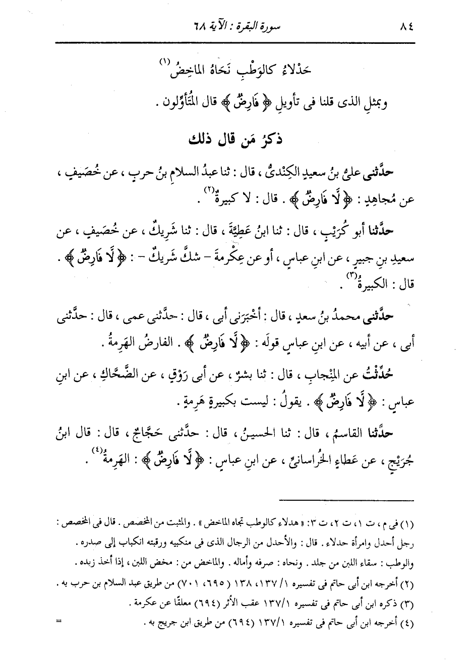 حَدَّثَنَا أَبُو كُرَيْبٍ، قَالَ: ثنا ابْنُ عَطِيَّةَ، قَالَ ثنا شَرِيكٌ، عَنْ خُصَيْفٍ، عَنْ سَعِيدِ بْنِ جُبَيْرٍ، عَنِ ابْنِ عَبَّاسٍ أَوْ عَنْ عِكْرِمَةَ، شَكَّ شَرِيكٌ: " {§لَا فَارِضٌ} [البقرة: 68] قَالَ: الْكَبِيرَةُ "