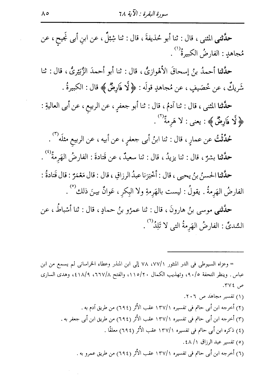 حَدَّثَنِي الْمُثَنَّى، قَالَ: ثنا أَبُو حُذَيْفَةَ، قَالَ: ثنا شِبْلٌ، عَنِ ابْنِ أَبِي نَجِيحٍ، عَنْ مُجَاهِدٍ: " §الْفَارِضُ: الْكَبِيرَةُ "