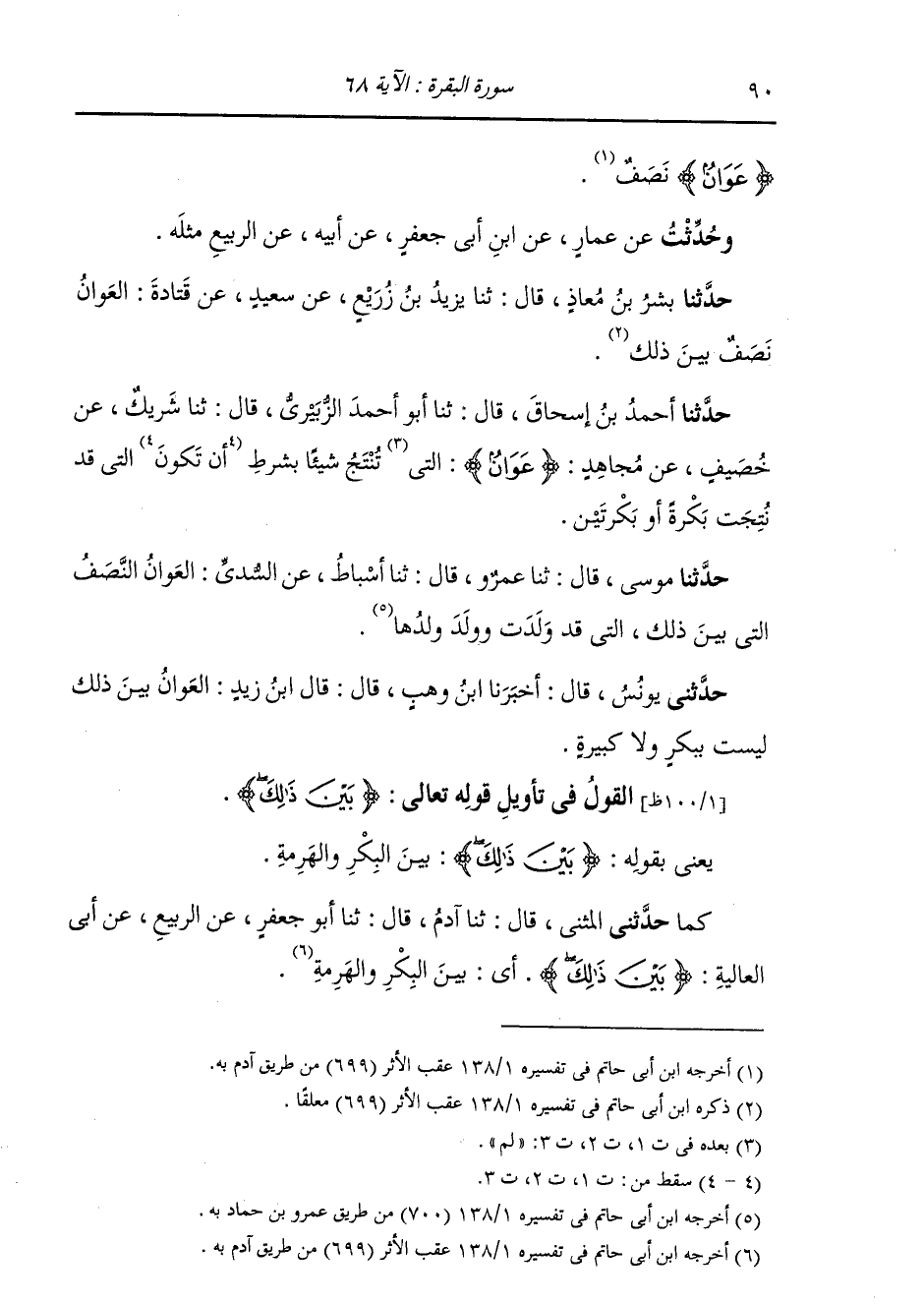 كَمَا حَدَّثَنِي الْمُثَنَّى، قَالَ: ثنا آدَمَ، قَالَ: ثنا أَبُو جَعْفَرٍ، عَنِ الرَّبِيعِ، عَنْ أَبِي الْعَالِيَةِ: " {§بَيْنَ ذَلِكَ} [البقرة: 68] أَيْ بَيْنَ الْبِكْرِ وَالْهَرِمَةِ "