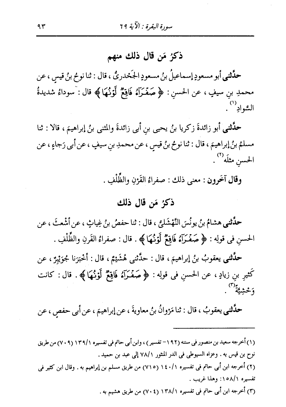 ذِكْرُ مَنْ قَالَ ذَلِكَ مِنْهُمْ حَدَّثَنِي أَبُو مَسْعُودٍ إِسْمَاعِيلُ بْنُ مَسْعُودٍ الْجَحْدَرِيُّ، قَالَ: ثنا نُوحُ بْنُ قَيْسٍ، عَنْ مُحَمَّدِ بْنِ سَيْفٍ، عَنِ الْحَسَنِ: " {§صَفْرَاءُ فَاقِعٌ لَوْنُهَا} [البقرة: 69] قَالَ: سَوْدَاءُ شَدِيدَةٌ السَّوَادُ " حَدَّثَنِي أَبُو زَائِدَةَ زَكَرِيَّا بْنُ يَحْيَى بْنِ أَبِي زَائِدَةَ، وَالْمُثَنَّى بْنُ إِبْرَاهِيمَ قَالَا: ثنا مُسْلِمُ بْنُ إِبْرَاهِيمَ، قَالَ، ثنا نُوحُ بْنُ قَيْسٍ، عَنْ مُحَمَّدِ بْنِ سَيْفٍ، عَنْ أَبِي رَجَاءٍ، عَنِ الْحَسَنِ، مِثْلَهُ وَقَالَ آخَرُونَ: مَعْنَى ذَلِكَ: صَفْرَاءُ الْقَرْنِ وَالظِّلْفِ