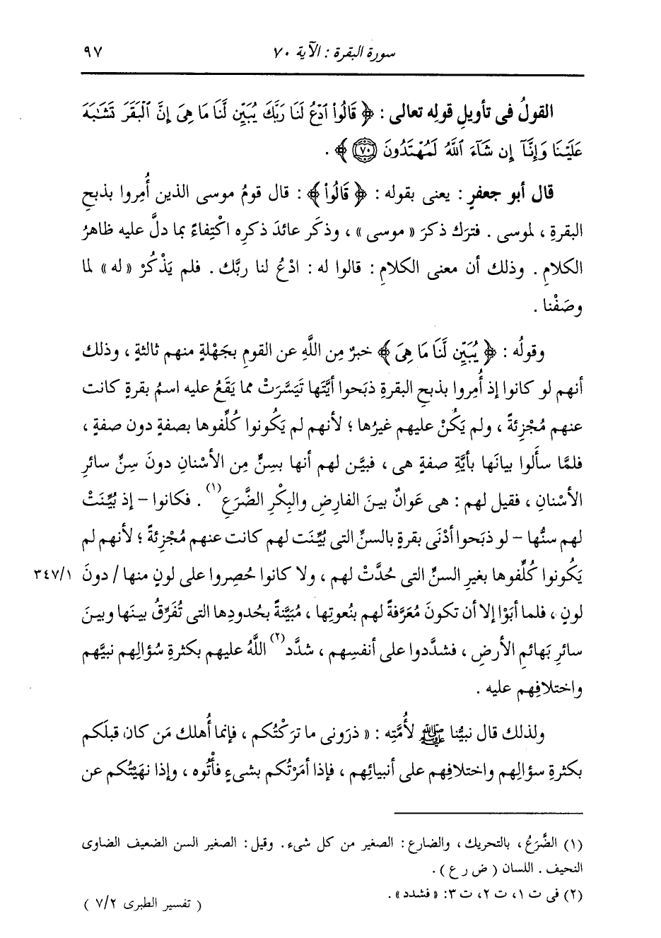 §يَعْنِي بِقَوْلِهِ: {قَالُوا} [البقرة: 11] قَالَ قَوْمُ مُوسَى الَّذِينَ أُمِرُوا بِذِبْحِ الْبَقَرَةِ لِمُوسَى. فَتَرَكَ ذِكْرَ مُوسَى وَذَكَرَ عَائِدَ ذِكْرِهِ اكْتِفَاءً بِمَا دَلَّ عَلَيْهِ ظَاهِرُ الْكَلَامِ. وَذَلِكَ أَنَّ مَعْنَى الْكَلَامِ: قَالُوا لَهُ: ادْعُ رَبَّكَ، فَلَمْ يَذْكُرْ لَهُ لِمَا وَصَفْنَا. وَقَوْلِهِ: {يُبَيِّنْ لَنَا مَا هِيَ} [البقرة: 68] خَيْرٌ مِنَ اللَّهِ عَنِ الْقَوْمِ بِجَهْلَةٍ مِنْهُمْ ثَالِثَةٍ، وَذَلِكَ أَنَّهُمْ لَوْ كَانُوا إِذْ أُمِرُوا بِذِبْحِ الْبَقَرَةِ ذَبَحُوا أَيَّتُهَا تَيَسَّرَتْ مِمَّا يَقَعُ عَلَيْهِ اسْمُ بَقَرَةٍ كَانَتْ عَنْهُمْ مُجْزِئَةً، وَلَمْ يَكُنْ عَلَيْهِمْ غَيْرُهَا، لِأَنَّهُمْ لَمْ يَكُونُوا كُلِّفُوهَا بِصِفَةٍ دُونَ صِفَةٍ، فَلَمَّا سَأَلُوا بَيَانَهَا بِأَيِّ صِفَةٍ هِيَ، فَبَيَّنَ لَهُمْ أَنَّهَا بِسِنٍّ مِنَ الْأَسْنَانِ دُونَ سِنِّ سَائِرِ الْأَسْنَانِ، فَقِيلَ لَهُمْ: هِيَ عَوَانٌ بَيْنَ الْفَارِضِ وَالْبِكْرِ الضَّرْعِ. فَكَانُوا إِذَا بُيِّنَتْ لَهُمْ سِنُّهَا لَوْ ذَبَحُوا أَدْنَى بَقَرَةٍ بِالسِّنِّ الَّتِي بُيِّنَتْ لَهُمْ كَانَتْ عَنْهُمْ مُجْزِئَةً، لِأَنَّهُمْ لَمْ يَكُونُوا كُلِّفُوهَا بِغَيْرِ السِّنِّ الَّتِي حُدَّتْ لَهُمْ، وَلَا كَانُوا حَصَرُوا عَلَى لَوْنٍ مِنْهَا دُونَ لَوْنٍ. فَلَمَّا أَبَوْا إِلَّا أَنْ تَكُونَ مَعْرِفَةً لَهُمْ بِنُعُوتِهَا مُبَيَّنَةً بِحُدُودِهَا الَّتِي تُفَرِّقُ بَيْنَهَا وَبَيْنَ سَائِرِ بَهَائِمِ الْأَرْضِ فَشَدَّدُوا عَلَى أَنْفُسِهِمْ شَدَّدَ اللَّهُ عَلَيْهِمْ بِكَثْرَةِ سُؤَالِهِمْ نَبِيَّهُمْ وَاخْتِلَافِهِمْ عَلَيْهِ، وَلِذَلِكَ قَالَ نَبِيُّنَا صَلَّى اللهُ عَلَيْهِ وَسَلَّمَ لِأُمَّتِهِ: «ذَرُونِي مَا تَرَكْتُكُمْ فَإِنَّمَا أُهْلِكَ مَنْ كَانَ قَبْلَكُمْ بِكَثْرَةِ سُؤَالِهِمْ وَاخْتِلَافِهِمْ عَلَى أَنْبِيَائِهِمْ، فَإِذَا أَمَرْتُكُمْ بِشَيْءٍ فَأْتُوهُ، وَإِذَا نَهَيْتُكُمْ عَنْ