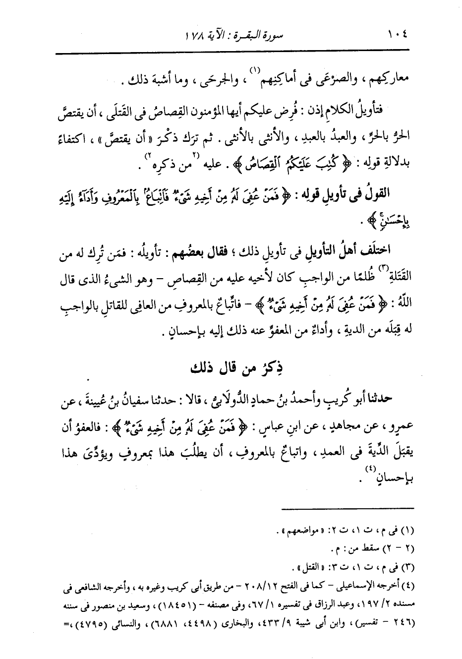 §الْقَوْلُ فِي تَأْوِيلِ قَوْلِهِ تَعَالَى: فَمَنْ عُفِيَ لَهُ مِنْ أَخِيهِ شَيْءٌ فَاتِّبَاعٌ بِالْمَعْرُوفِ وَأَدَاءٌ إِلَيْهِ بِإِحْسَانٍ اخْتَلَفَ أَهْلُ التَّأْوِيلِ فِي تَأْوِيلِ ذَلِكَ، فَقَالَ بَعْضُهُمْ: تَأْوِيلُهُ: فَمَنْ تُرِكَ لَهُ مِنَ الْقَتْلِ ظُلْمًا مِنَ الْوَاجِبِ كَانَ لِأَخِيهِ عَلَيْهِ مِنَ الْقِصَاصِ، وَهُوَ الشَّيْءُ الَّذِي قَالَ اللَّهُ: فَمَنْ عُفِيَ لَهُ مِنْ أَخِيهِ شَيْءٌ فَاتِّبَاعٌ مِنَ الْعَافِي لِلْقَاتِلِ بِالْوَاجِبِ لَهُ قِبَلَهُ مِنَ الدِّيَةِ وَأَدَاءٌ مِنَ الْمَعْفُوِّ عَنْهُ ذَلِكَ إِلَيْهِ بِإِحْسَانٍ