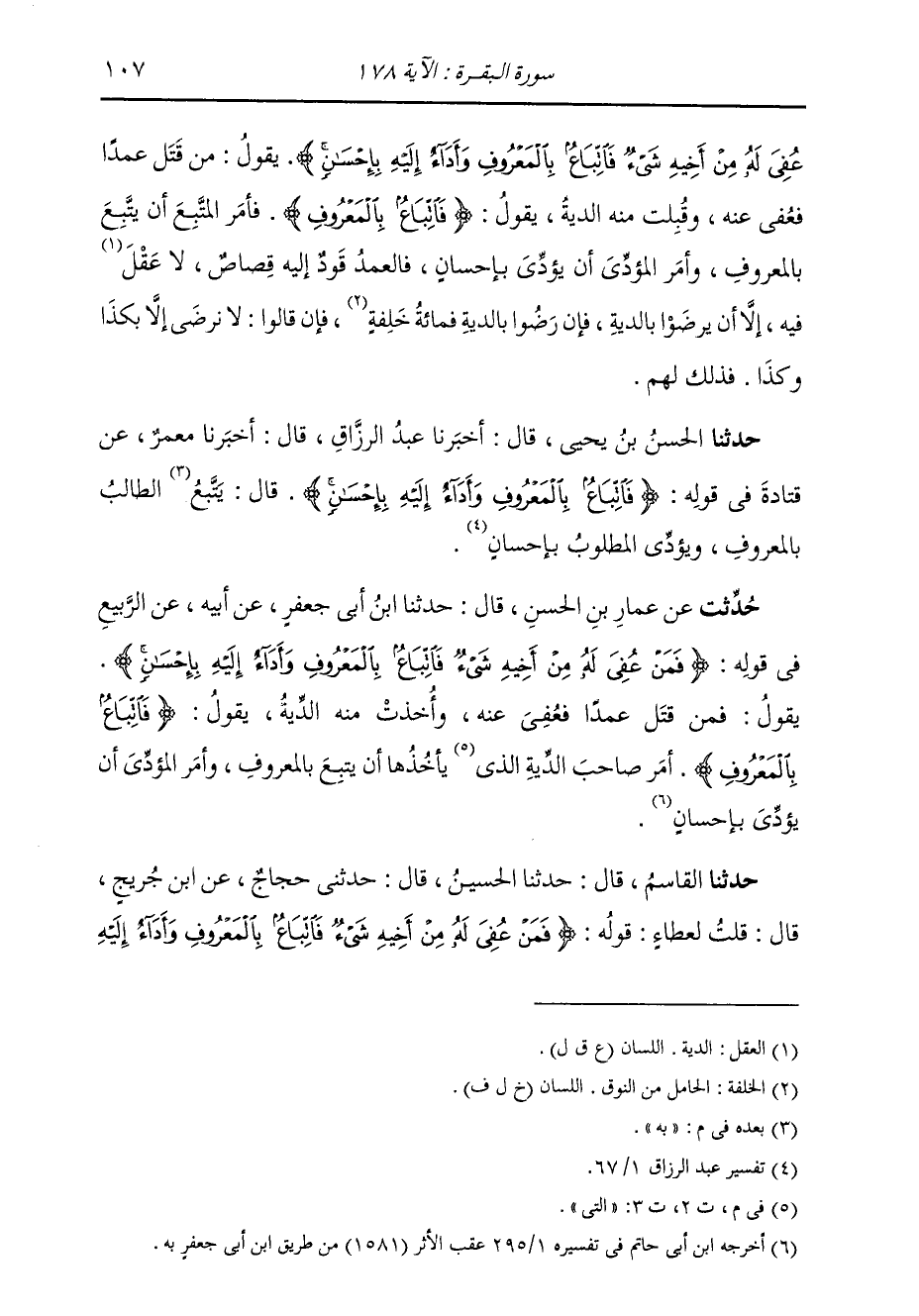 حُدِّثْتُ عَنْ عَمَّارٍ، قَالَ: ثنا ابْنُ أَبِي جَعْفَرٍ، عَنْ أَبِيهِ، عَنِ الرَّبِيعِ، فِي قَوْلِهِ: {§فَمَنْ عُفِيَ لَهُ مِنْ أَخِيهِ شَيْءٌ فَاتِّبَاعٌ بِالْمَعْرُوفِ وَأَدَاءٌ إِلَيْهِ بِإِحْسَانٍ} [البقرة: 178] يَقُولُ " فَمَنْ قَتَلَ عَمْدًا فَعُفِيَ عَنْهُ وَأُخِذَتْ مِنْهُ الدِّيَةُ، يَقُولُ: {فَاتِّبَاعٌ بِالْمَعْرُوفِ} [البقرة: 178] أَمَرَ صَاحِبَ الدِّيَةِ الَّتِي يَأْخُذُهَا أَنْ يَتَّبِعَ بِالْمَعْرُوفِ، وَأَمَرَ الْمُؤَدِّيَ أَنْ يُؤَدِّيَ بِإِحْسَانٍ "