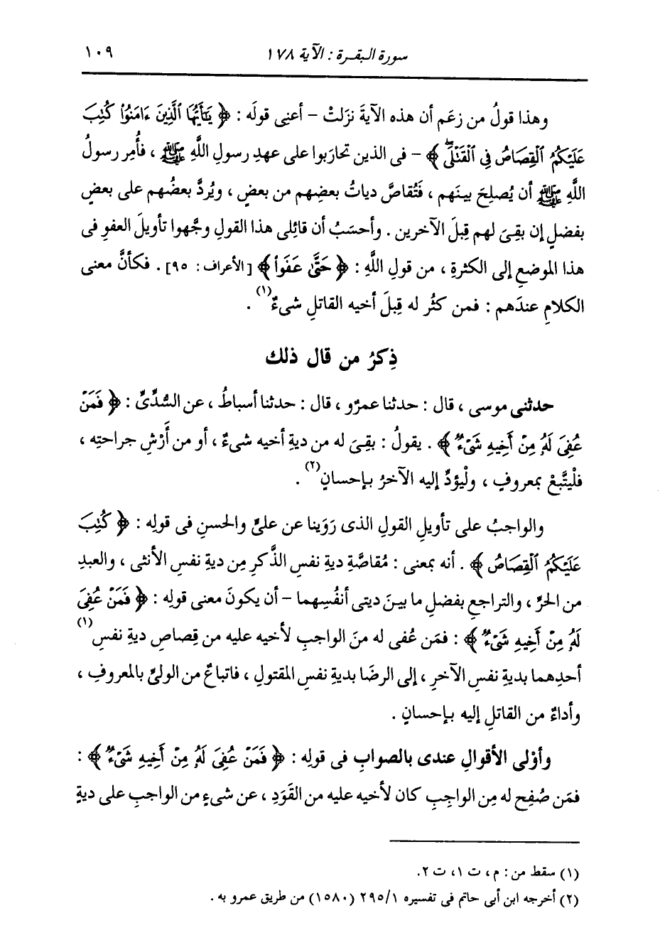 ذِكْرُ مَنْ قَالَ ذَلِكَ حَدَّثَنِي مُوسَى بْنُ هَارُونَ، قَالَ: ثنا عَمْرُو بْنُ حَمَّادٍ، قَالَ: ثنا أَسْبَاطٌ، عَنِ السُّدِّيِّ: {§فَمَنْ عُفِيَ لَهُ مِنْ أَخِيهِ شَيْءٌ} [البقرة: 178] يَقُولُ «بَقِيَ لَهُ مِنْ دِيَةِ أَخِيهِ شَيْءٌ أَوْ مِنْ أَرْشِ جِرَاحَتِهِ، فَلْيَتَّبِعْ بِمَعْرُوفٍ وَلْيُؤَدِ الْآخَرَ إِلَيْهِ بِإِحْسَانٍ» وَالْوَاجِبُ عَلَى تَأْوِيلِ الْقَوْلِ الَّذِي رُوِّينَا عَنْ عَلِيٍّ، وَالْحَسَنِ فِي قَوْلِهِ: {كُتِبَ عَلَيْكُمُ الْقِصَاصُ} [البقرة: 178] أَنَّهُ بِمَعْنَى مُقَاصَّةِ دِيَةِ النَّفْسِ الذَّكَرِ مِنْ دِيَةِ النَّفْسِ الْأُنْثَى، وَالْعَبْدُ مِنَ الْحُرِّ، وَالتَّرَاجُعِ بِفَضْلِ مَا بَيْنَ دِيَتَيْ أَنْفُسِهِمَا أَنْ يَكُونَ مَعْنَى قَوْلِهِ: {فَمَنْ عُفِيَ لَهُ مِنْ أَخِيهِ شَيْءٌ} [البقرة: 178] فَمَنْ عُفِيَ لَهُ مِنَ الْوَاجِبِ لِأَخِيهِ عَلَيْهِ مِنْ قِصَاصِ دِيَةِ أَحَدِهِمَا بِدِيَةِ نَفْسِ الْآخَرِ إِلَى الرِّضَا بِدِيَةِ نَفْسِ الْمَقْتُولِ، فَاتِّبَاعٌ مِنَ الْوَلِيِّ بِالْمَعْرُوفِ، وَأَدَاءٌ مِنَ الْقَاتِلِ إِلَيْهِ ذَلِكَ بِإِحْسَانٍ. وَأَوْلَى الْأَقْوَالِ عِنْدِي بِالصَّوَابِ فِي قَوْلِهِ: {فَمَنْ عُفِيَ لَهُ مِنْ أَخِيهِ شَيْءٌ} [البقرة: 178] فَمَنْ صُفِحَ لَهُ مِنَ الْوَاجِبِ كَانَ لِأَخِيهِ عَلَيْهِ مِنَ الْقَوَدِ عَنْ شَيْءٍ مِنَ الْوَاجِبِ عَلَى دِيَةٍ -[110]- يَأْخُذُهَا مِنْهُ، فَاتِّبَاعٌ بِالْمَعْرُوفِ مِنَ الْعَافِي عَنِ الدَّمِ الرَّاضِي بِالدِّيَةِ مِنْ دَمِ وَلِيِّهِ، وَأَدَاءٌ إِلَيْهِ مِنَ الْقَاتِلِ ذَلِكَ بِإِحْسَانٍ؛ لِمَا قَدْ بَيَّنَّا مِنَ الْعِلَلِ فِيمَا مَضَى قَبْلُ مِنْ أَنِّ مَعْنَى قَوْلِ اللَّهِ تَعَالَى ذِكْرُهُ: {كُتِبَ عَلَيْكُمُ الْقِصَاصُ} [البقرة: 178] إِنَّمَا هُوَ الْقِصَاصُ مِنَ النُّفُوسِ الْقَاتِلَةِ أَوِ الْجَارِحَةِ، وَالشَّاجَّةِ عَمْدًا، كَذَلِكَ الْعَفْوُ أَيْضًا عَنْ ذَلِكَ. وَأَمَّا مَعْنَى قَوْلِهِ: {فَاتِّبَاعٌ بِالْمَعْرُوفِ} [البقرة: 178] فَإِنَّهُ يَعْنِي: فَاتِّبَاعٌ عَلَى مَا أَوْجَبُهُ اللَّهُ لَهُ مِنَ الْحَقِّ قِبَلَ قَاتِلِ وَلِيِّهِ مِنْ غَيْرِ أَنْ يَزْدَادَ عَلَيْهِ مَا لَيْسَ لَهُ عَلَيْهِ فِي أَسْنَانِ الْفَرَائِضِ أَوْ غَيْرِ ذَلِكَ، أَوْ يُكَلِّفُهُ مَا لَمْ يُوجِبْهُ اللَّهُ لَهُ عَلَيْهِ