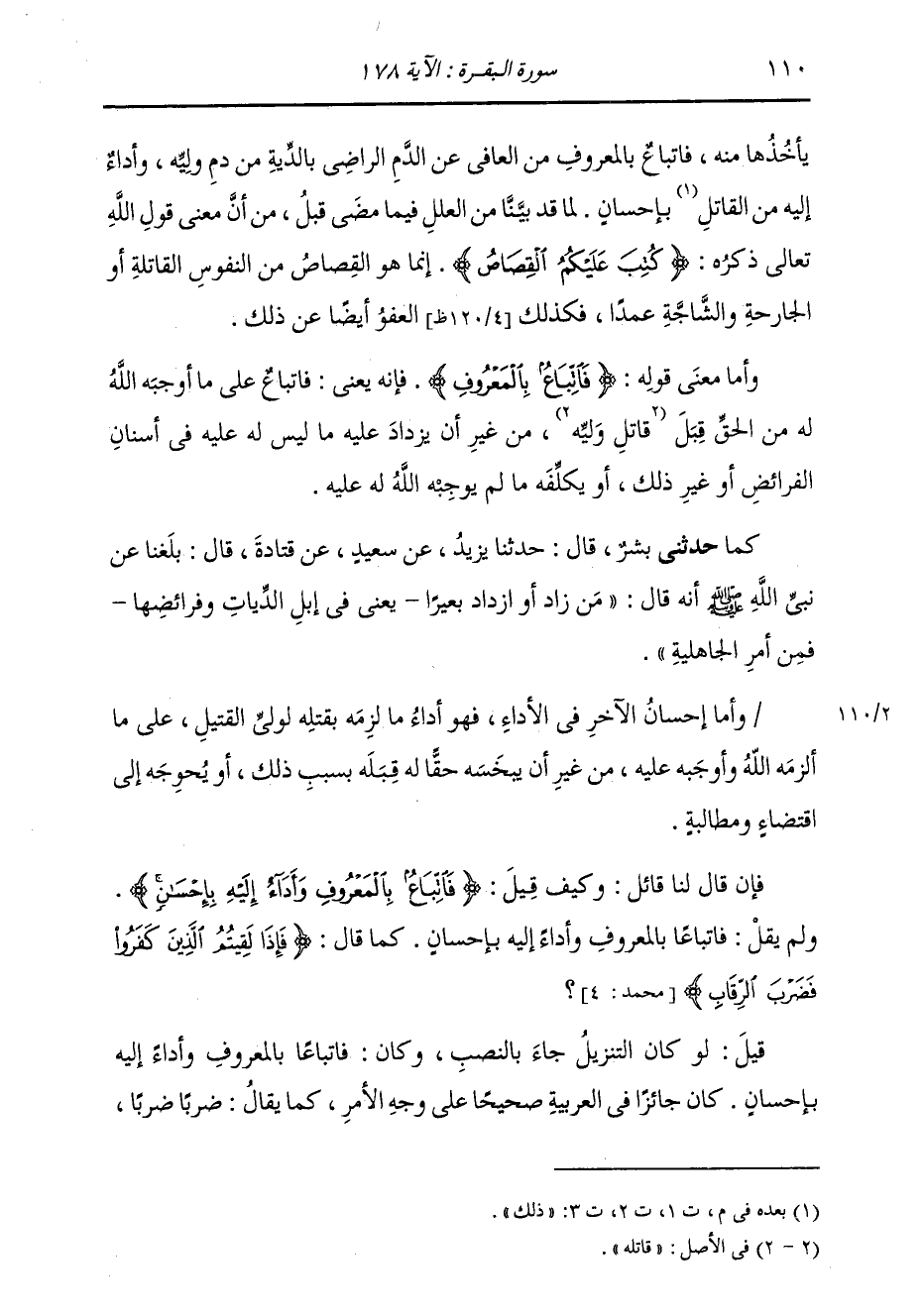 كَمَا حَدَّثَنِي بِشْرُ بْنُ مُعَاذٍ، قَالَ: ثنا يَزِيدُ، قَالَ: ثنا سَعِيدٌ، عَنْ قَتَادَةَ، قَالَ: بَلَغَنَا عَنْ نَبِيِّ اللَّهِ صَلَّى اللهُ عَلَيْهِ وَسَلَّمَ أَنَّهُ قَالَ: «§مَنْ زَادَ أَوِ ازْدَادَ بَعِيرًا» يَعْنِي فِي إِبِلِ الدِّيَاتِ وَفَرَائِضِهَا «فَمِنْ أَمْرِ الْجَاهِلِيَّةِ» وَأَمَّا إِحْسَانُ الْآخَرِ فِي الْأَدَاءِ، فَهُوَ أَدَاءُ مَا لَزِمَهُ بِقَتْلِهِ لِوَلِيٍّ الْقَتِيلِ عَلَى مَا أَلْزَمَهُ اللَّهُ وَأَوْجَبَهُ عَلَيْهِ مِنْ غَيْرِ أَنْ يَبْخَسَهُ حَقًّا لَهُ قِبَلَهُ بِسَبَبِ ذَلِكَ، أَوْ يُحْوِجَهُ إِلَى اقْتِضَاءٍ وَمُطَالَبَةٍ. فَإِنْ قَالَ لَنَا قَائِلٌ: وَكَيْفَ قِيلَ: {فَاتِّبَاعٌ بِالْمَعْرُوفِ وَأَدَاءٌ إِلَيْهِ بِإِحْسَانٍ} [البقرة: 178] وَلَمْ يَقُلْ: فَاتِّبَاعًا بِالْمَعْرُوفِ وَأَدَاءٌ إِلَيْهِ بِإِحْسَانٍ كَمَا قَالَ: {فَإِذَا لَقِيتُمُ الَّذِينَ كَفَرُوا فَضَرْبَ الرِّقَابِ} [محمد: 4] قِيلَ: لَوْ كَانَ التَّنْزِيلُ جَاءَ بِالنَّصْبِ، وَكَانَ: فَاتِّبَاعًا بِالْمَعْرُوفِ وَأَدَاءٌ إِلَيْهِ بِإِحْسَانٍ، كَانَ جَائِزًا فِي الْعَرَبِيَّةِ صَحِيحًا عَلَى وَجْهِ الْأَمْرِ، كَمَا يُقَالُ: ضَرْبًا ضَرْبًا،