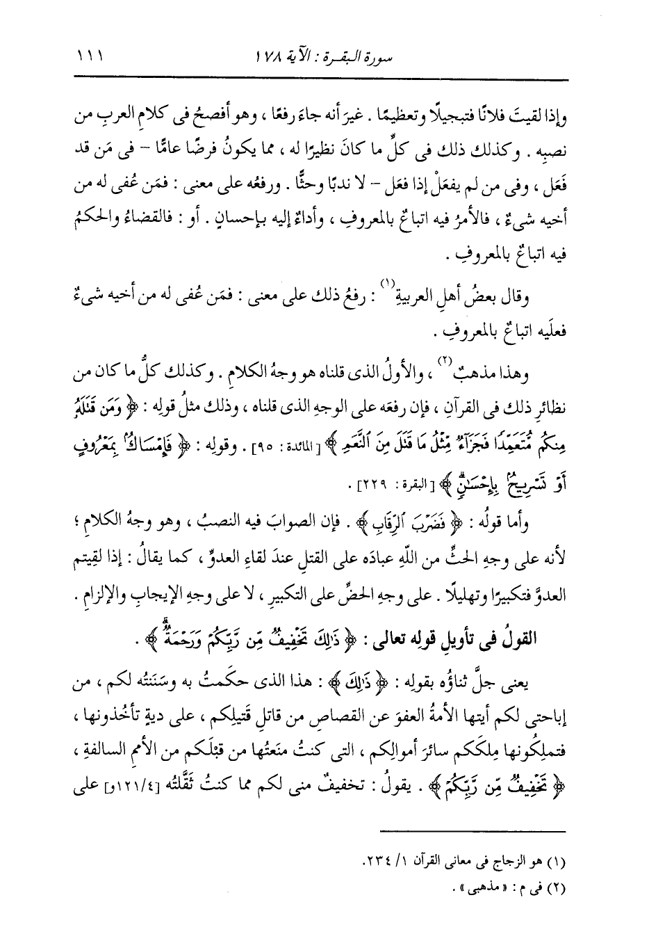 وَإِذَا لَقِيتَ فُلَانًا فَتَبْجِيلًا، وَتَعْظِيمًا غَيْرَ أَنَّهُ جَاءَ رَفْعًا وَهُوَ أَفْصَحُ فِي كَلَامِ الْعَرَبِ مِنْ نَصْبِهِ، وَكَذَلِكَ ذَلِكَ فِي كُلِّ مَا كَانَ نَظِيرًا لَهُ مِمَّا يَكُونُ فَرْضًا عَامًا فِيمَنْ قَدْ فَعَلَ، وَفِيمَنْ لَمْ يَفْعَلْ إِذَا فَعَلَ، لَا نَدْبًا وَحَثًّا. وَرَفْعُهُ عَلَى مَعْنَى: فَمَنْ عُفِيَ لَهُ مِنْ أَخِيهِ شَيْءٌ فَالْأَمْرُ فِيهِ اتِّبَاعٌ بِالْمَعْرُوفِ، وَأَدَاءٌ إِلَيْهِ بِإِحْسَانٍ، أَوْ: فَالْقَضَاءُ وَالْحُكْمُ فِيهِ اتِّبَاعٌ بِالْمَعْرُوفِ. وَقَدْ قَالَ بَعْضُ أَهْلِ الْعَرَبِيَّةِ: رُفِعَ ذَلِكَ عَلَى مَعْنَى: فَمَنْ عُفِيَ لَهُ مِنْ أَخِيهِ شَيْءٌ فَعَلَيْهِ اتِّبَاعٌ بِالْمَعْرُوفِ. وَهَذَا مَذْهَبِي، وَالْأَوَّلُ الَّذِي قُلْنَاهُ هُوَ وَجْهُ الْكَلَامِ، وَكَذَلِكَ كُلُّ مَا كَانَ مِنْ نَظَائِرِ ذَلِكَ فِي الْقُرْآنِ فَإِنْ رَفَعَهُ عَلَى الْوَجْهِ الَّذِي قُلْنَاهُ، وَذَلِكَ مِثْلُ قَوْلِهِ: {وَمَنْ قَتَلَهُ مِنْكُمْ مُتَعَمِّدًا فَجَزَاءٌ مِثْلُ مَا قَتَلَ مِنَ النَّعَمِ} [المائدة: 95] وَقَوْلُهُ: {فَإِمْسَاكٌ بِمَعْرُوفٍ أَوْ تَسْرِيحٌ بِإِحْسَانٍ} [البقرة: 229] وَأَمَّا قَوْلُهُ: {فَضَرْبَ الرِّقَابِ} [محمد: 4] فَإِنَّ الصَّوَابَ فِيهِ النَّصْبَ، وَهُوَ وَجْهُ الْكَلَامِ لِأَنَّهُ عَلَى وَجْهِ الْحَثِّ مِنَ اللَّهِ تَعَالَى ذِكْرُهُ عِبَادَهُ عَلَى الْقَتْلِ عِنْدَ لِقَاءِ الْعَدُوِّ كَمَا يُقَالُ: إِذَا لَقِيتُمُ الْعَدُوَّ فَتَكْبِيرًا وَتَهْلِيلًا، عَلَى وَجْهِ الْحَضِّ عَلَى التَّكْبِيرِ لَا عَلَى وَجْهِ الْإِيجَابِ وَالْإِلْزَامِ