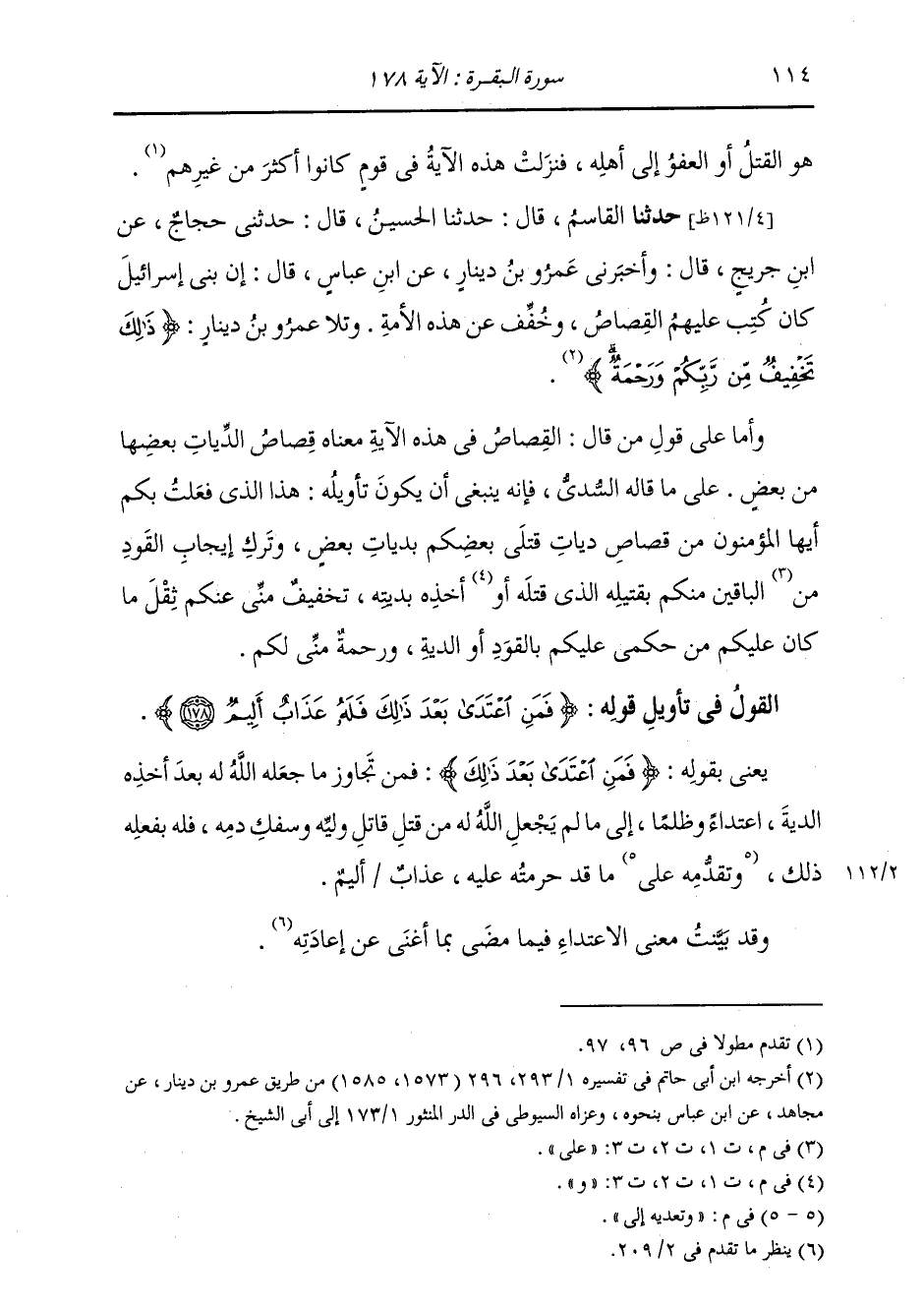 حَدَّثَنَا الْقَاسِمُ، قَالَ: ثنا الْحُسَيْنُ، قَالَ: حَدَّثَنِي حَجَّاجٌ، عَنِ ابْنِ جُرَيْجٍ، قَالَ: وَأَخْبَرَنِي عَمْرُو بْنُ دِينَارٍ، عَنِ ابْنِ عَبَّاسٍ، قَالَ «إِنَّ بَنِي إِسْرَائِيلَ كَانَ §كُتِبَ عَلَيْهِمُ الْقِصَاصُ، وَخُفِّفَ عَنْ هَذِهِ الْأُمَّةِ» وَتَلَا، عَمْرُو بْنُ دِينَارٍ: {ذَلِكَ تَخْفِيفٌ مِنْ رَبِّكُمْ وَرَحْمَةٌ} [البقرة: 178] وَأَمَّا عَلَى قَوْلِ مَنْ قَالَ: الْقِصَاصُ فِي هَذِهِ الْآيَةِ مَعْنَاهُ: قِصَاصُ الدِّيَاتِ بَعْضُهَا مِنْ بَعْضٍ عَلَى مَا قَالَهُ السُّدِّيُّ، فَإِنَّهُ يَنْبَغِي أَنْ يَكُونَ تَأْوِيلُهُ: هَذَا الَّذِي فَعَلْتُ بِكُمْ أَيُّهَا الْمُؤْمِنُونَ مِنْ قِصَاصِ دِيَاتِ قَتْلَى بَعْضُكُمْ بِدِيَاتِ بَعْضٍ وَتَرْكُ إِيجَابِ الْقَوَدِ عَلَى الْبَاقِينَ مِنْكُمْ بِقَتِيلِهِ الَّذِي قَتَلَهُ وَأَخْذِهِ بِدِيَتِهِ، تَخْفِيفٌ مِنِّي عَنْكُمْ ثِقَلٌ مَا كَانَ عَلَيْكُمْ مِنْ حُكْمِي عَلَيْكُمْ بِالْقَوَدِ، أَوِ الدِّيَةِ وَرَحْمَةٌ مِنِّي لَكُمْ
