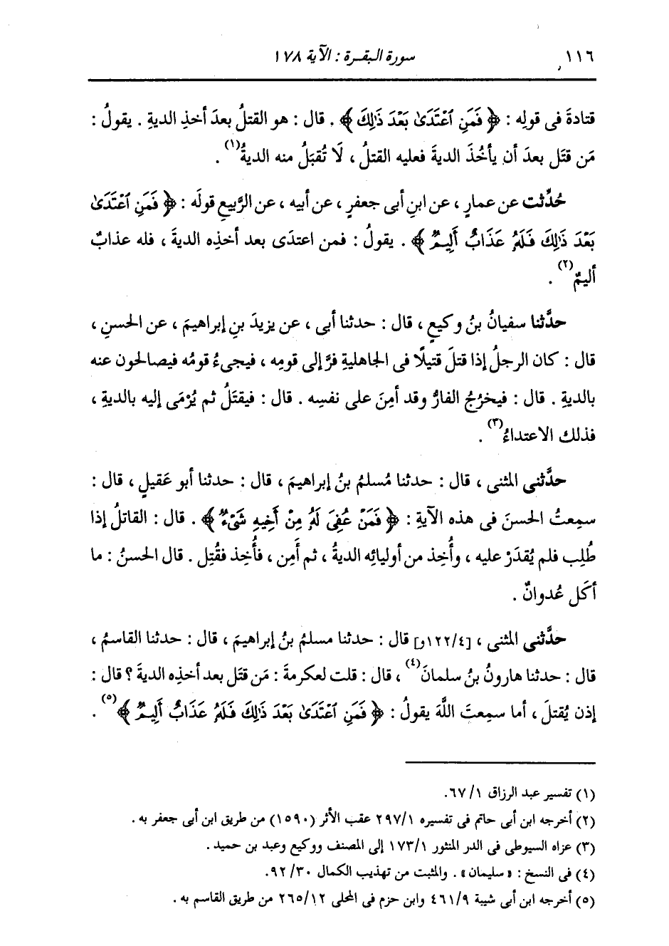 حَدَّثَنِي الْمُثَنَّى، قَالَ: ثنا مُسْلِمٌ، قَالَ: ثنا الْقَاسِمُ، قَالَ: ثنا هَارُونُ بْنُ سُلَيْمَانَ، قَالَ قُلْتُ لِعِكْرِمَةَ، «مَنْ قَتَلَ بَعْدَ أَخْذِهِ الدِّيَةَ؟ قَالَ» إِذًا يُقْتَلُ، أَمَا سَمِعْتَ اللَّهَ يَقُولُ: {§فَمَنِ اعْتَدَى بَعْدَ ذَلِكَ فَلَهُ عَذَابٌ أَلِيمٌ} [البقرة: 178] "