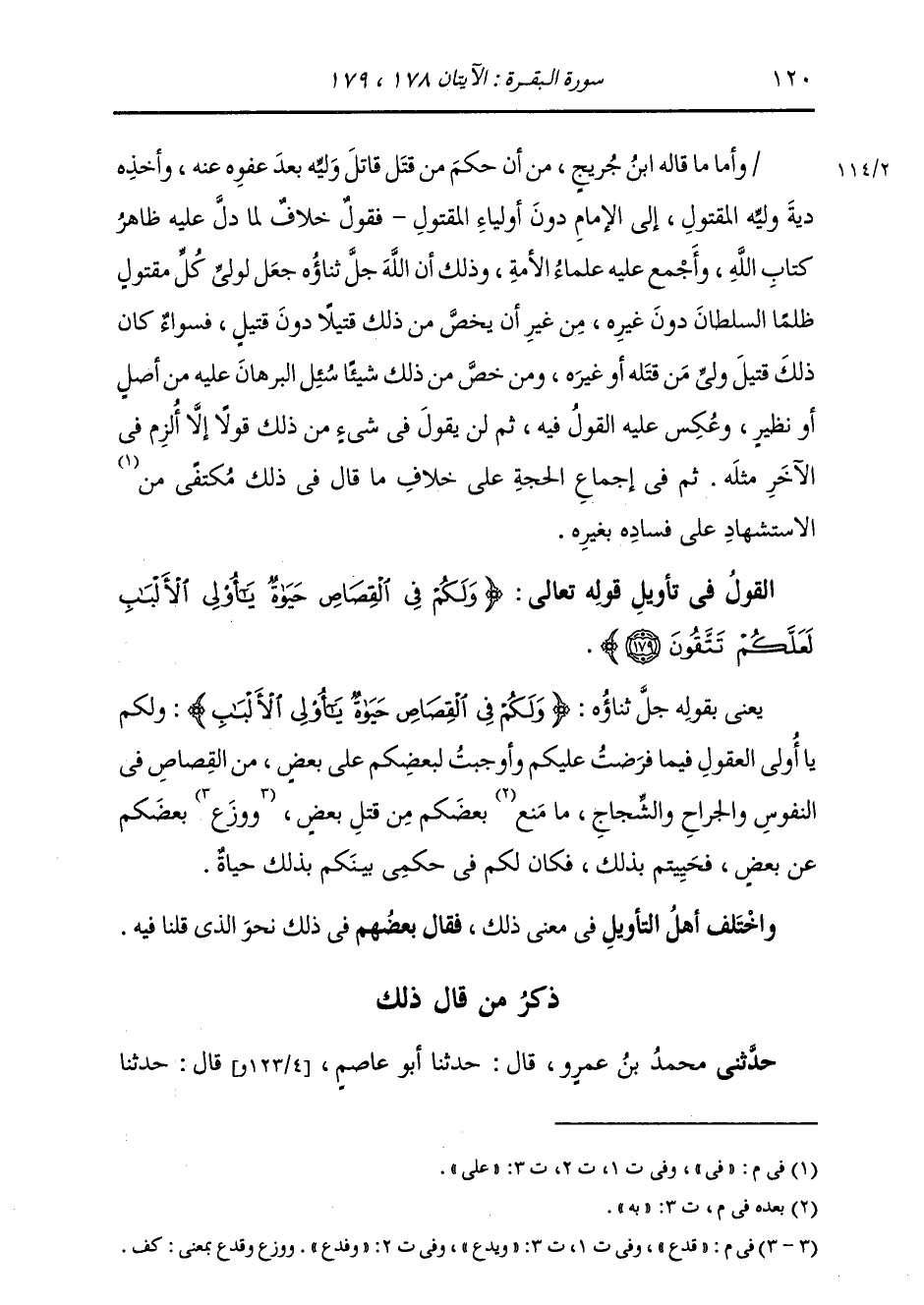 §الْقَوْلُ فِي تَأْوِيلِ قَوْلِهِ تَعَالَى: {وَلَكُمْ فِي الْقِصَاصِ حَيَاةٌ يَا أُولِي الألْبَابِ لَعَلَّكُمْ تَتَّقُون} [البقرة: 179]
