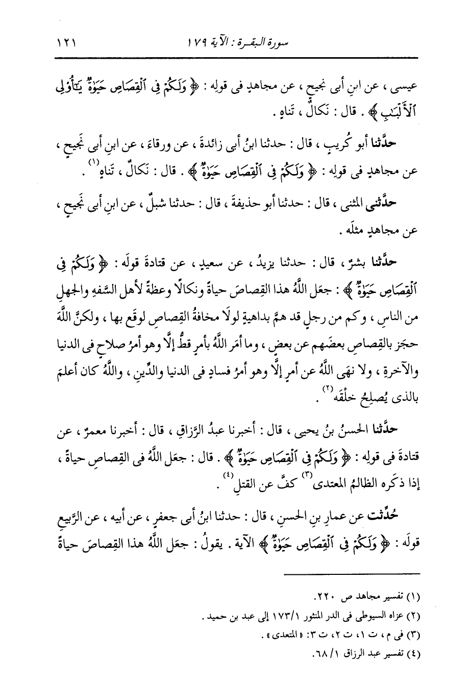 حَدَّثَنَا أَبُو كُرَيْبٍ، قَالَ: ثنا ابْنُ أَبِي زَائِدَةَ، عَنْ وَرْقَاءَ، عَنِ ابْنِ أَبِي نَجِيحٍ، عَنْ مُجَاهِدٍ فِي قَوْلِهِ " {§وَلَكُمْ فِي الْقِصَاصِ حَيَاةٌ} [البقرة: 179] قَالَ: نَكَالٌ، تَنَاهٍ " حَدَّثَنِي الْمُثَنَّى، قَالَ: ثنا أَبُو حُذَيْفَةَ، قَالَ: ثنا شِبْلٌ، عَنِ ابْنِ أَبِي نَجِيحٍ، عَنْ مُجَاهِدٍ مِثْلَهُ