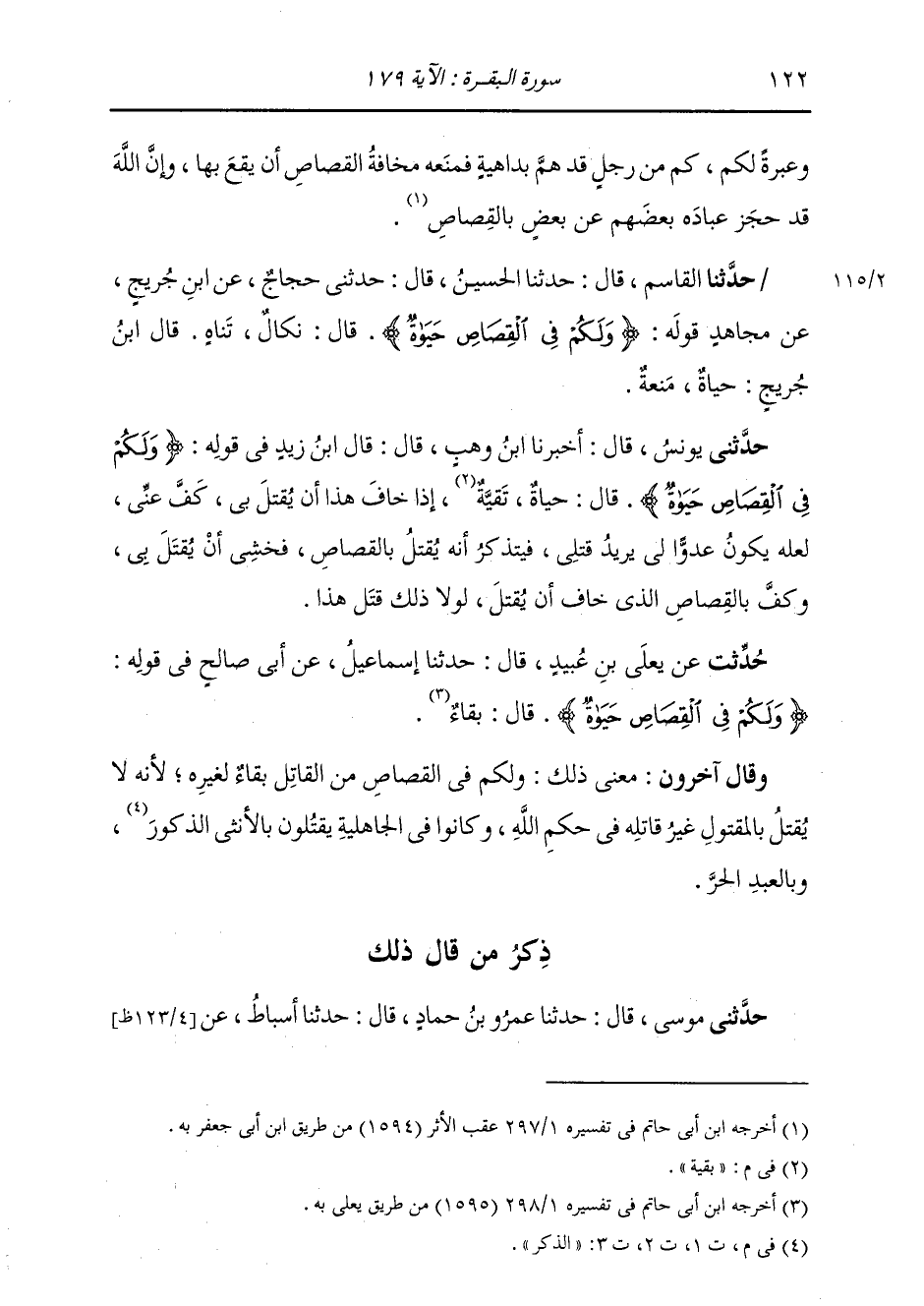 ذِكْرُ مَنْ قَالَ ذَلِكَ حَدَّثَنِي مُوسَى بْنُ هَارُونَ، قَالَ: ثنا عَمْرُو بْنُ حَمَّادٍ، قَالَ: ثنا أَسْبَاطٌ، عَنِ -[123]- السُّدِّيِّ، " {§وَلَكُمْ فِي الْقِصَاصِ حَيَاةٌ} [البقرة: 179] يَقُولُ: بَقَاءٌ، لَا يُقْتَلُ إِلَّا الْقَاتِلُ بِجِنَايَتِهِ "